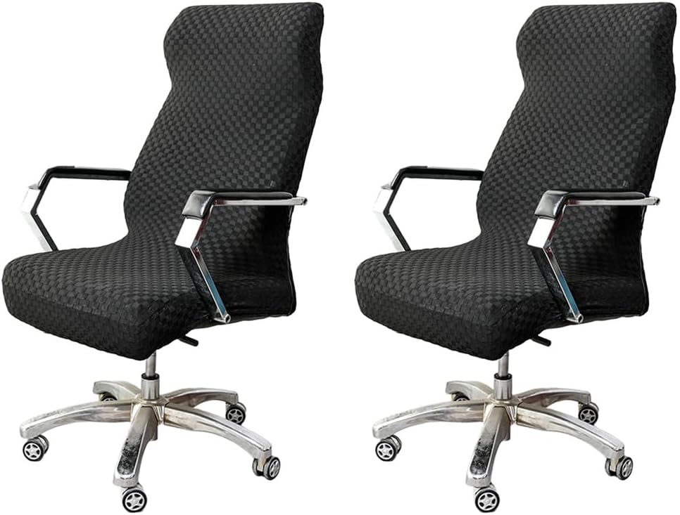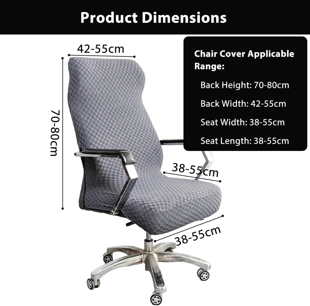 Features:Soft and thick, hand washable or machine washable, can be folded and stored when not in use, long lasting and durabilityElastic edge design ensures that the chair cover wraps tightly around the seat and backrest to prevent sliding, easy to install and removeUniversal, suitable for armchairs, armless chairs, swivel chairs, executive chairs, task chairs, computer chairs, gaming chairs, office chairs, dining chairs, etc.Specifications:Product name: Office Chair CoverStyle: Modern and MinimalistMaterial: 92% Polyester + 8% SpandexColors: Black, Light Gray, Dark Gray, Khaki, BlueFunction: Wear-resistant, soft and comfortable, decorativeSize rangeBack Height: 70-80cmBack Width: 42-55cmSeat Width: 38-55cmSeat Length: 38-55cmSingle weight: about 270gSuitable for: all seasons(Please measure your chair before purchasing to make sure it can be installed.)Includes:2 x Office Chair Cover(excluding chair and any other items)Please Attention:Due to different light and screen, the color of the item may be slightly different from the image.Due to manual measurement, please leave a distance of 1-2 cm. Please understand us, thank you very much.