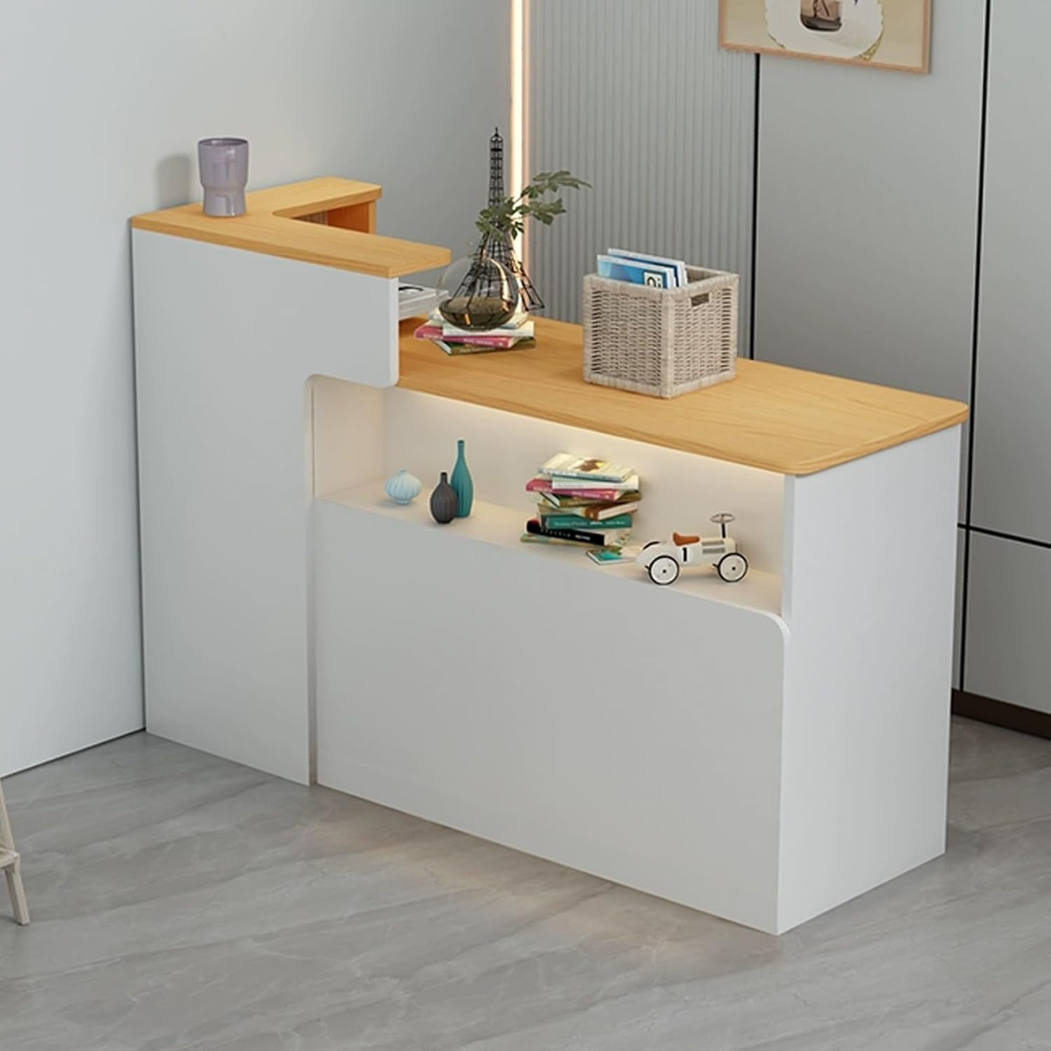 This YUGXTH counter table is stylish and beautiful, combining simple and fashionable lines to ignite your passion for life.Reception counter desk LED ambient lighting designAdd a little color difference and atmosphere to the space, giving you a different visual experience.Retail checkout counter has abundant space to meet your different storage needs, wide desktop with top hutch offer additional storage space.Specifications:Product name: small reception desk,Material: woodColor: Wood color, White, Gray,Natural Style: left, rightStyle: modern and simpleLength: 80cm/31.5in, 100cm/39.3in, 120cm/47.2inWidth: 50cm/19.6inHeight: 100cm/39.3inApplicable scenarios: clothing stores, beauty salons, etc.Package Includes:1 x Cashier Counter.Attention.1. Due to monitor differences, there may be slight color difference.2. Due to the measurement method, measurement method and other factors, there may be a slight error.