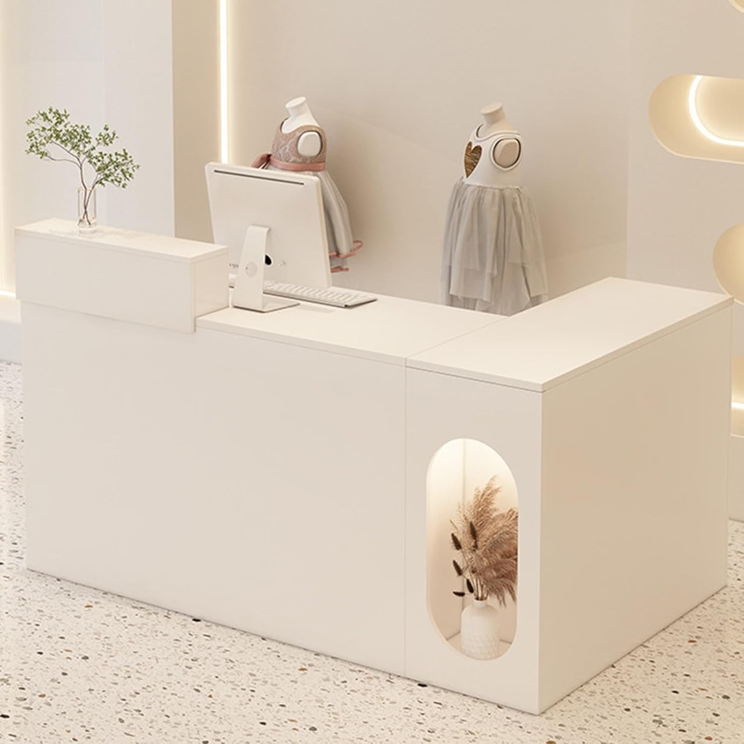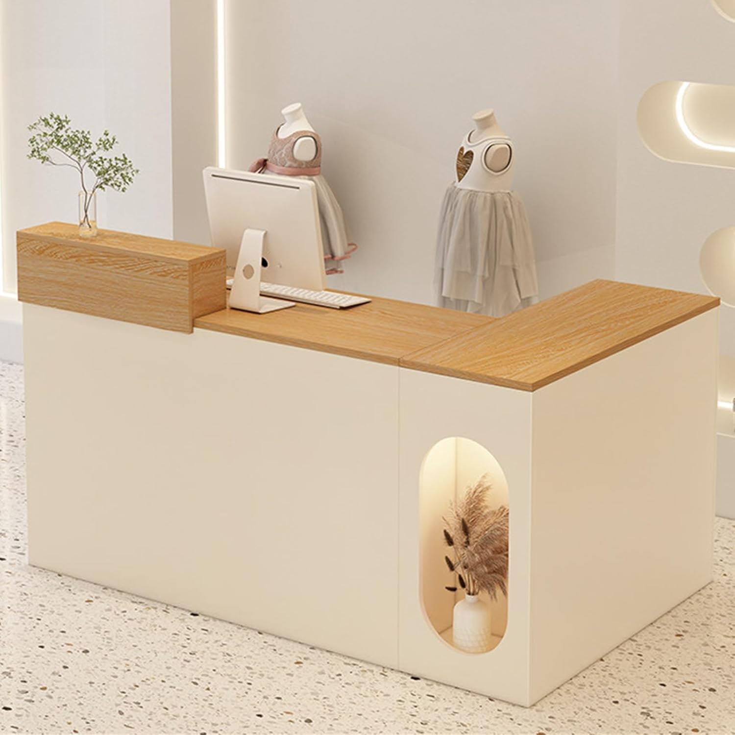 This YQMHEZ reception desk used as a corporate reception desk, cashier counter or salon reception desk, no matter where you use it, this eye-catching product can enhance the overall atmosphere and leave a positive first impressionProduct style: Modern and simpleReception counter dimensions: 120x100x100cm,47.2x39.3x39.3inProduct name: Reception Table, Front Counter Desk, Reception Desk Counter, Reception Desk, Counter TableColor: White + Brown, White + Natural, White + Gray, White, Off-white + Natural, Off-white + White, Off-white + BrownMaterial: MDFApplicable scenarios: Clothing stores, beauty salons, etc.NOTESManual measurement has been used, there may be some reasonable error