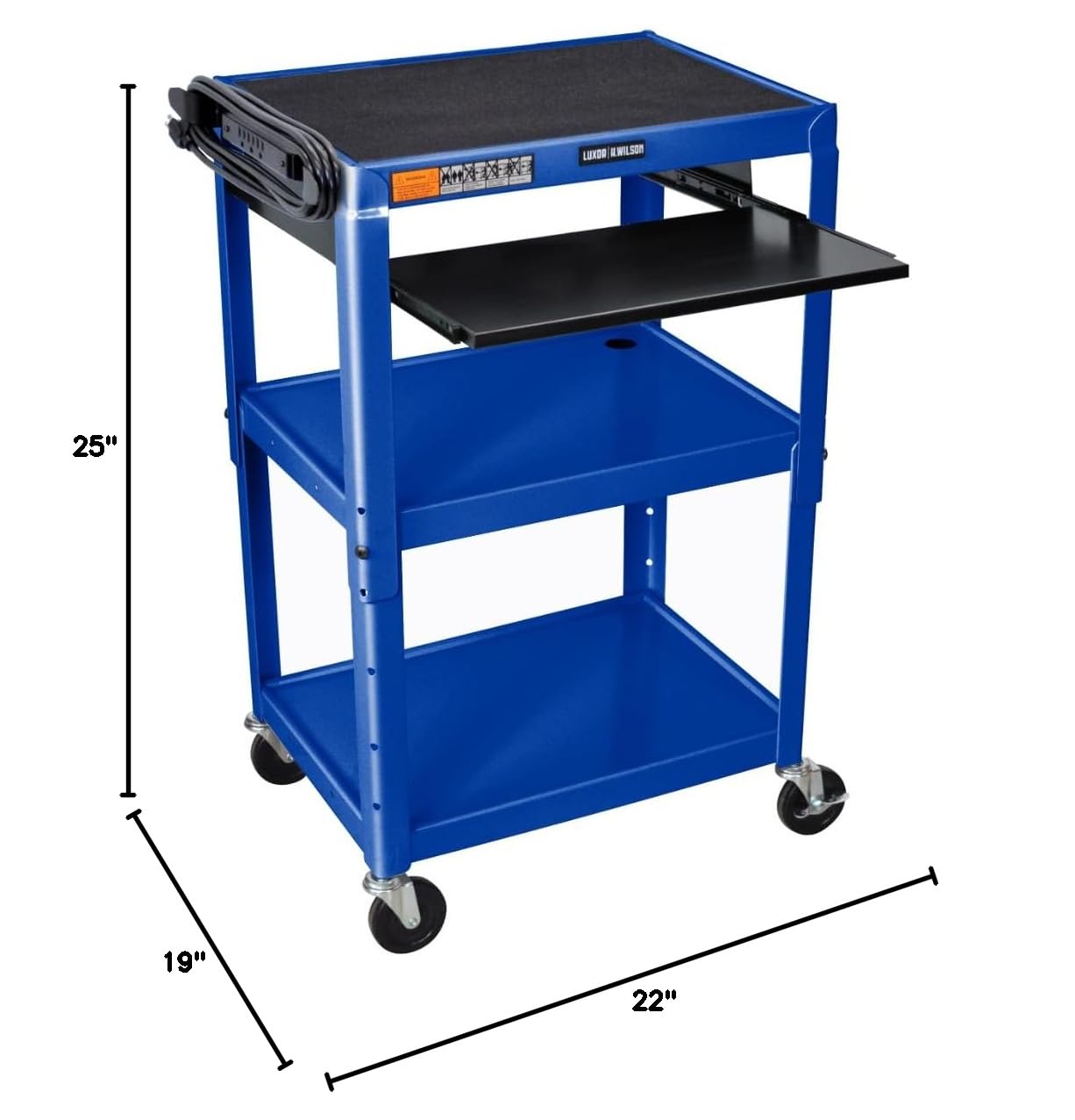 Elevate your workspace efficiency with the LUXOR UCMT1KB-RB Adjustable-Height Steel Utility Cart in striking Royal Blue. Designed to streamline tasks and enhance productivity, this versatile cart offers multifunctional utility for various industries. Its adjustable height accommodates diverse users and tasks, while the convenient pullout keyboard tray facilitates seamless laptop use, ideal for presentations or data entry on-the-go. Featuring sturdy steel construction and roll-formed shelves with a powder coat painted finish, this cart ensures durability and stability even in demanding environments. With easy-access cable holes keeping cords organized and a retaining lip on all three shelves ensuring secure transport of equipment, this cart promotes a clutter-free and efficient workspace. Whether used in offices, classrooms, or warehouses, the LUXOR UCMT1KB-RB enhances workflow, organization, and ultimately, boosts productivity and sales.