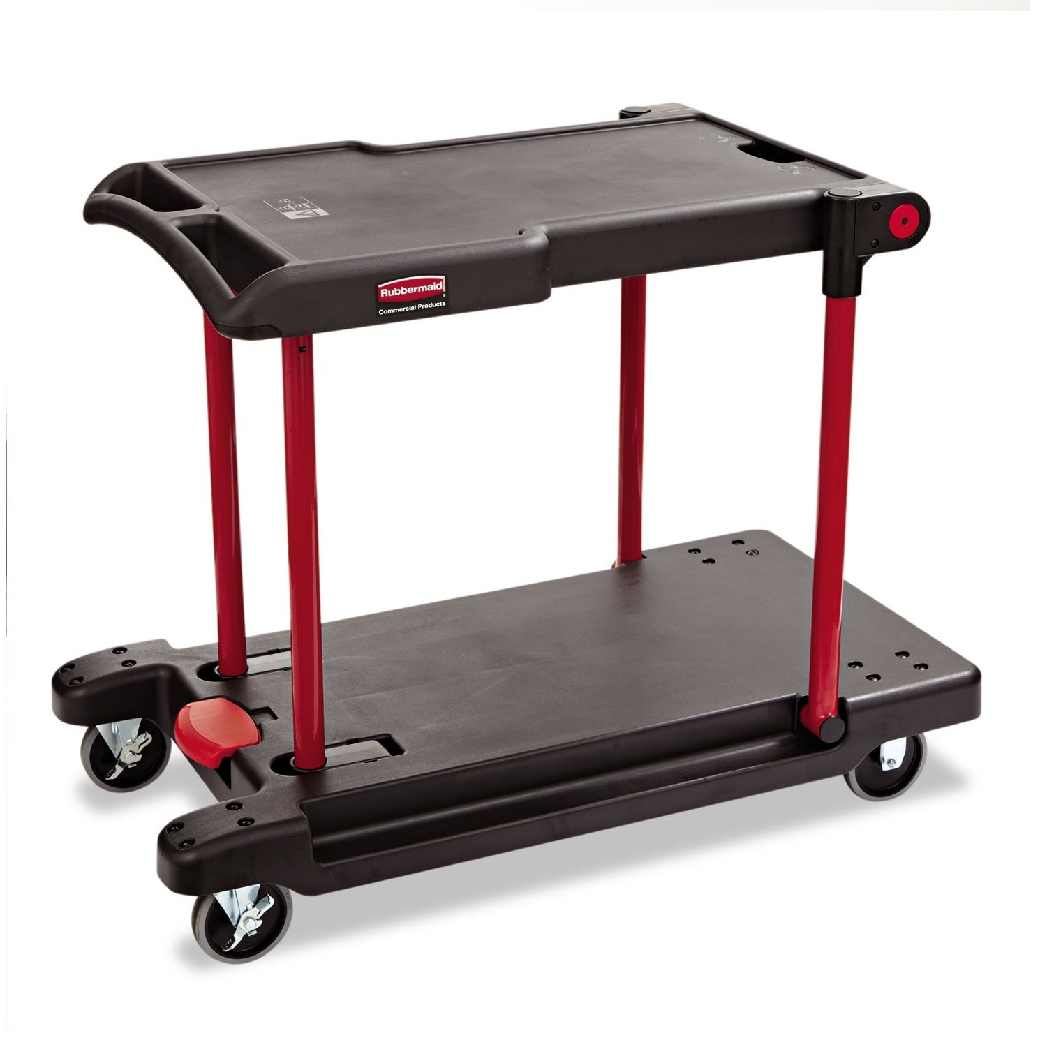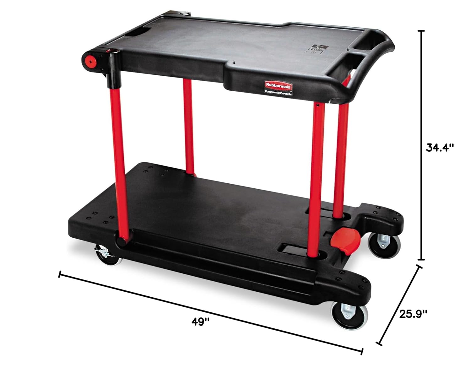 The Rubbermaid Commercial Convertible Utility Cart is ideal for moving large, heavy loads in almost any environment. Design converts from a utility cart to a platform truck in just seconds. Multifunctional productivity with improved worker well-being saves you time and money. Push buttons depress to easily convert from cart to platform truck, and foot pedal depresses to fold cart for storage. Rear wheel locking casters keep cart safely in place while loading and unloading. Ergonomic handle designed for comfort. Recessed top helps retain items on shelf during transport. Extended deck makes loading the lower shelf easier. Narrow profile easily navigates through doorways and hallways. 400 lb load capacity.