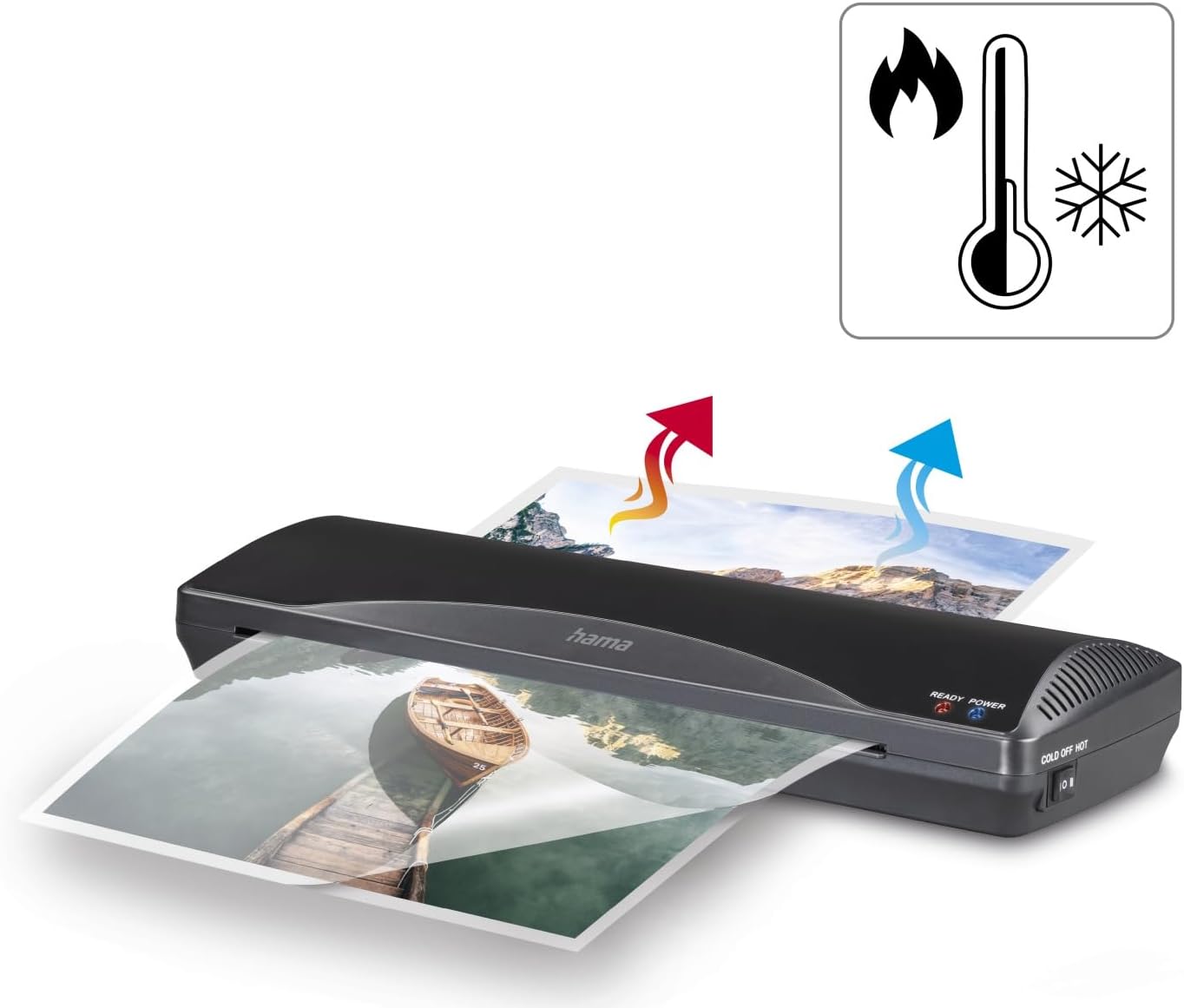 Hama Laminator Hot and Cold with Laminating Pouches A3 (Laminator for Cold Laminating and Hot Laminating, Fast Heating, Home, Home Office, Office, School, Anti-Lock Button, 80 to 125 mic) With the Hama laminator "Home & Office" you can laminate important documents, photos, business cards and more quickly and easily. The laminator has two different techniques: in cold lamination, the sealing is done by printing, the film can be removed without leaving any residue. The process is ideal for heat-sensitive documents such as thermal paper or laser copies. The hot lamination, on the other hand, is permanent and reliably protects against water, dirt and wear. After a short heating, the laminator is ready for use and welds your documents firmly and securely against counterfeiting. The heat protection prevents the thermal laminator from overheating. If paper or films are tilted in the laminator, you can solve the problem with the ABS function. The anti-lock system unlocks the two rollers and jammed films can be pulled out as much as possible without damage. Included are 5 laminating pouches in DIN A3 format. Technical details: Colour: black. Colour: black. Type: hot lamination/cold lamination. Design: tabletop device. Max. Heating time: 3 - 4 minutes. Max. Laminating width: 340 mm Max. Laminating speed: 250 mm/min. Max. Laminating height: 0.6 mm. Number of rolls: 2. Width x depth x height: 44 x 14 x 6.5 cm. Size: DIN A3. Max. Pocket thickness: 80-125 µ Use: office/private use. Consumer note: This product is intended for laminating documents both in the domestic and commercial sector, provided that the applications are comparable to the typical household application (e.g. in offices, workshops and hotels, etc.).