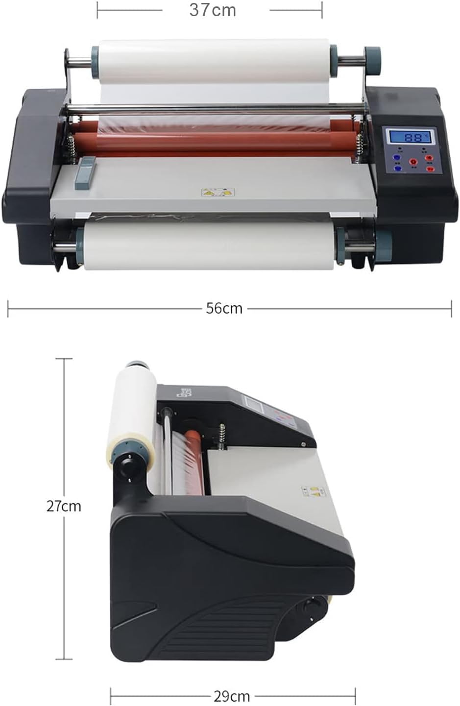 Specification Product name: double-sided automatic laminating machine Warm-up time: about 3 minutes Lamination speed: 55cm/min Film thickness: 0- 4mm Machine weight: about 11kg Lamination size: width 37cm length custom Lamination temperature: 88-170°C adjustable Voltage power: 220V / 50Hz, 800W. Machine size: 56X29X27cm Adaptable thickness: 80g copy paper, 6mm thick paper, PVC sheets of different materials, edged glass, other materials that can be mounted hot and cold