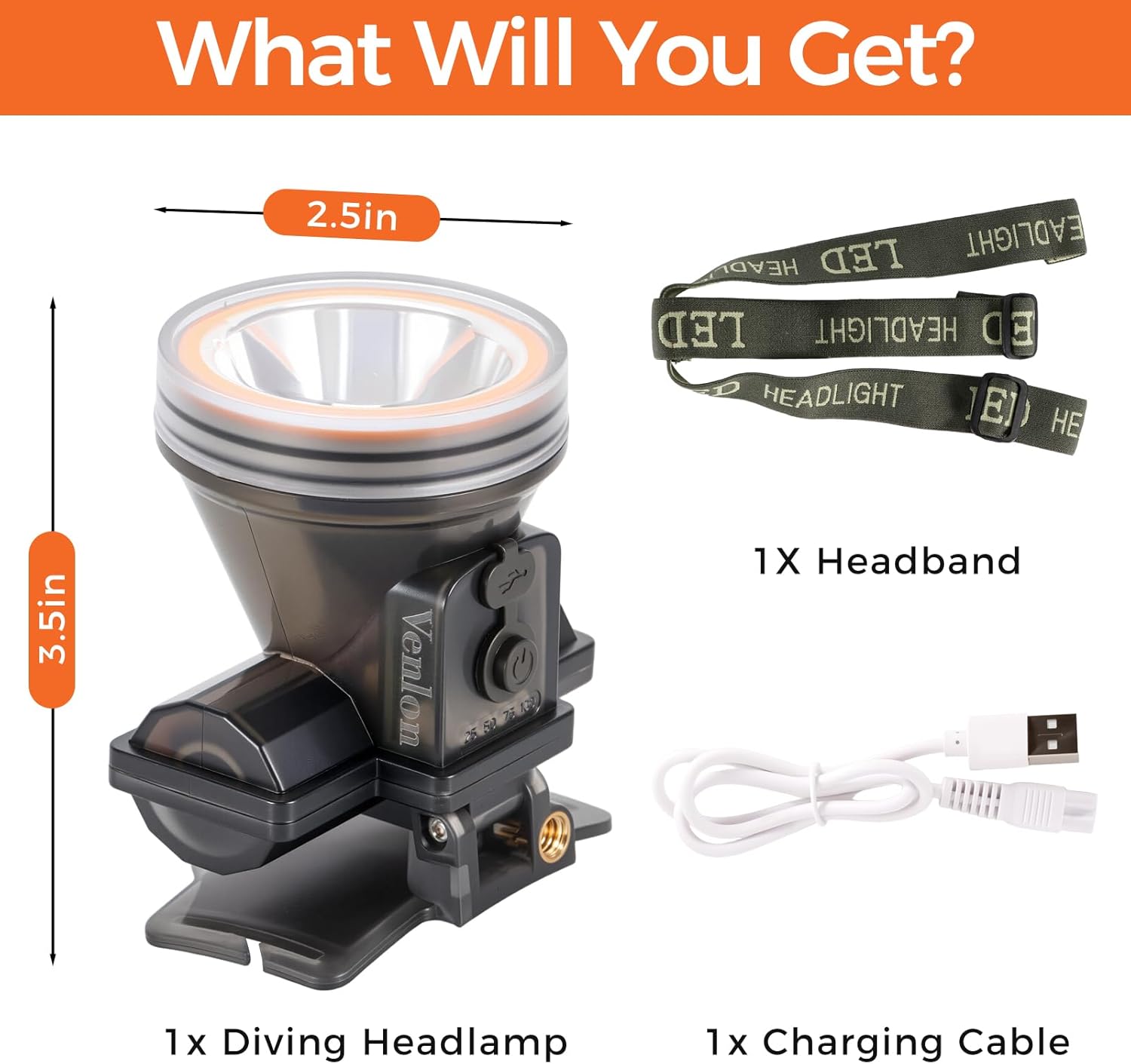 Venlon Rechargeable Diving Headlamp, IPX8 Waterproof Underwater Flashlight, 4 Modes with Battery Level indicator,10H Runtime Scuba Dive Light with Battery & USB Charger Cable