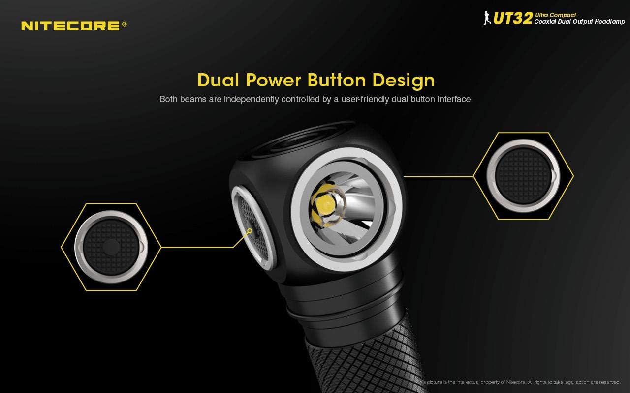 Nitecore UT32 Dual Emitter Headlamp - XP-L2 V6 (5700K, Cool White) - XP-L V6 (3000K, Warm White)Features:Dual output headlamp specifically designed for the unpredictable weather and harsh outdoor environment in trail runningPrimary Cool White Beam uses a Creee XP-L2 V6 LED 5700K for a max output of 1100 Lumens, with 100 degree wide range flood illumination with uniform and soft lightAuxilliary Warm White beam uses a CREE XP-L V6 LED (3000K) for a max of 920 lumens and 117 meter throw distanceHigh-efficiency constant current provides a stable output of 18 hours4 brightness levels and 2 special modes available for both beamsBoth LEDs can indicate the battery power by displaying the battery voltageIncorporated Advanced Temperature Regulation moduleSpecially designed lightweight and breathable headband includedOptical lenses with double-sided scratch-resistant coatingConstructed from aero-grade aluminum alloyHA III military grade hard-anodized finishSpecifications:LEDs:1 x CREE XP-L2 V6 (5700K) and 1 x CREE XP-L V6 (3000K)Output & Runtime:Primary Cool White Beam (CREE XP-L2 V6):Turbo:1100 lumens / 1 hour 30 minutes* / 80 metersHigh:410 lumens / 3 hours 45 minutes / 49 metersMedium:200 lumens / 8 hours / 33 metersLow:70 lumens / 18 hours / 23 metersBeacon:1100 lumensSOS:1100 lumensAuxiliary Warm White Beam (CREE XP-L V6):Turbo:920 lumens / 1 hour 30 minutes* / 117 metersHigh:370 lumens / 3 hours 45 minutes / 75 metersMedium:170 lumens / 8 hours / 46 metersLow:60 lumens / 18 hours / 31 metersBeacon:920 lumensSOS:920 lumensDimensions:Length:3.78" (95.9mm)Head Dimensions:1.09" x 1.06" (27.6mm x 26.8mm)Tail Diameter:0.94" (23.8mm)Weight:2.91oz (82.5g battery not included)Included Accessories:Spare O-ringSpare switch coversClipHeadbandBracket