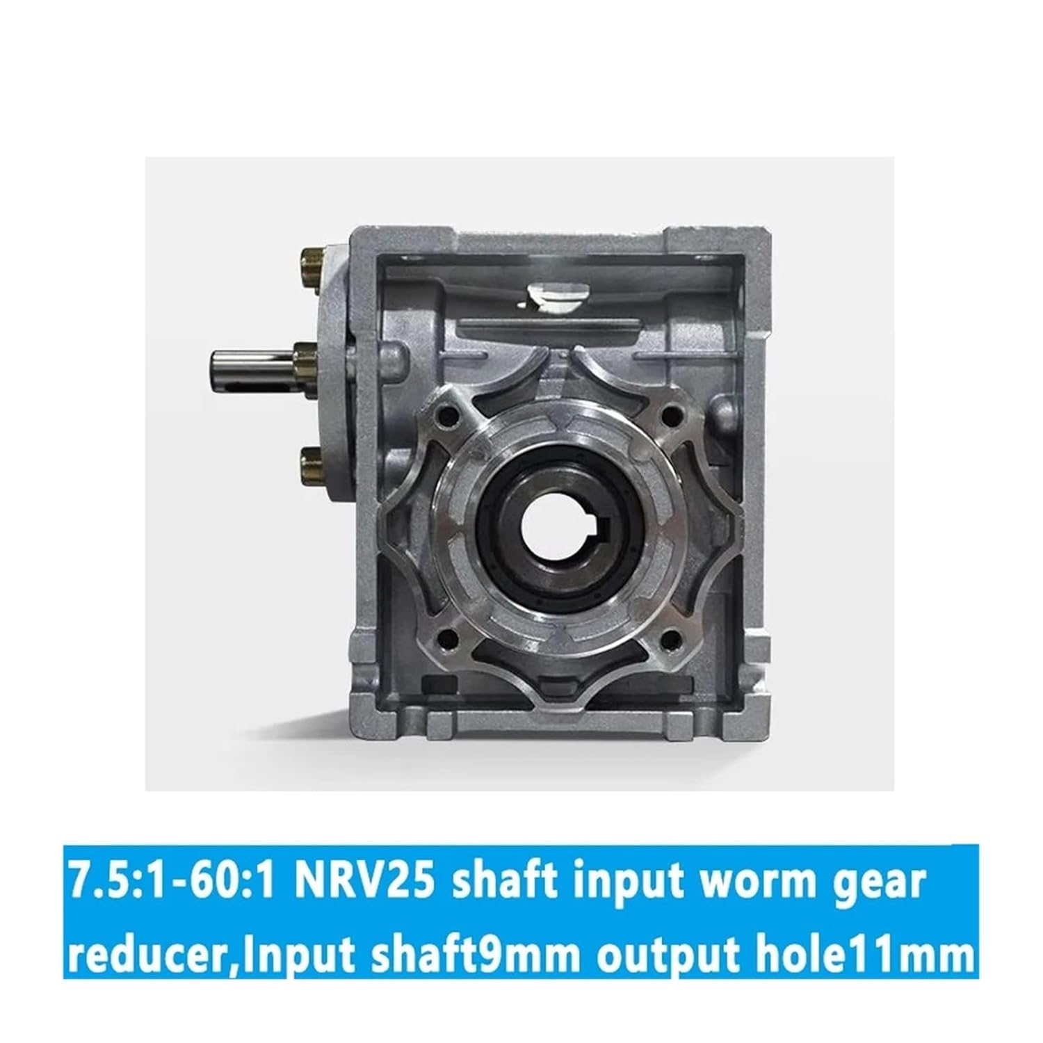 7.5:1-60:1 NRV25 shaft input worm gear reducer, Input shaft 9mm output hole 11mm, hand crank turbine reducerworm gear reducer*1pcNote:with a ratio of 5: 1, 7.5: 1, 10: 1, 15: 1, 20: 1, 25: 1, 30:1,40: 1, 50: 1, 60: 1, 80: 1 for customers.color: silver and blue (sometims only one color available)this link worm reducer without output shaft, if necessary, please contact us or order this link.Material for worm reducergearbox:Worm wheel:Nodular cast iron and bronzeWorm shaft: 20Cr steel.The hardness of surface is 56-62HRC with carbonized layer 0.3-0.5mmHousing:aluminum with oven paintingColor:silverFeature ofworm reducer gearbox:1) High quality aluminum alloy die cast gearbox2) High accuracy worm gear and worm shaft3) Less noise and lower temperature increase4) Easy mounting and linking, high efficiencyDrawing of NRV30 worm reducer gearbox:Output Speed : Varies with changes in speed ratioInput Speed : about 1500rpmRated Power : 0.06KW-0.18 kwOutput Torque : 2.6n.M-24 N.mModel Number : NRV25 shaft input worm gear reducerGearing Arrangement : WormSpeed ratio : 5:1,7.5:1,10:1,15:1,20:1,25:1,30:1,40:1,50:1,60:1,80:1for customers.Output hole diameter : 11mm