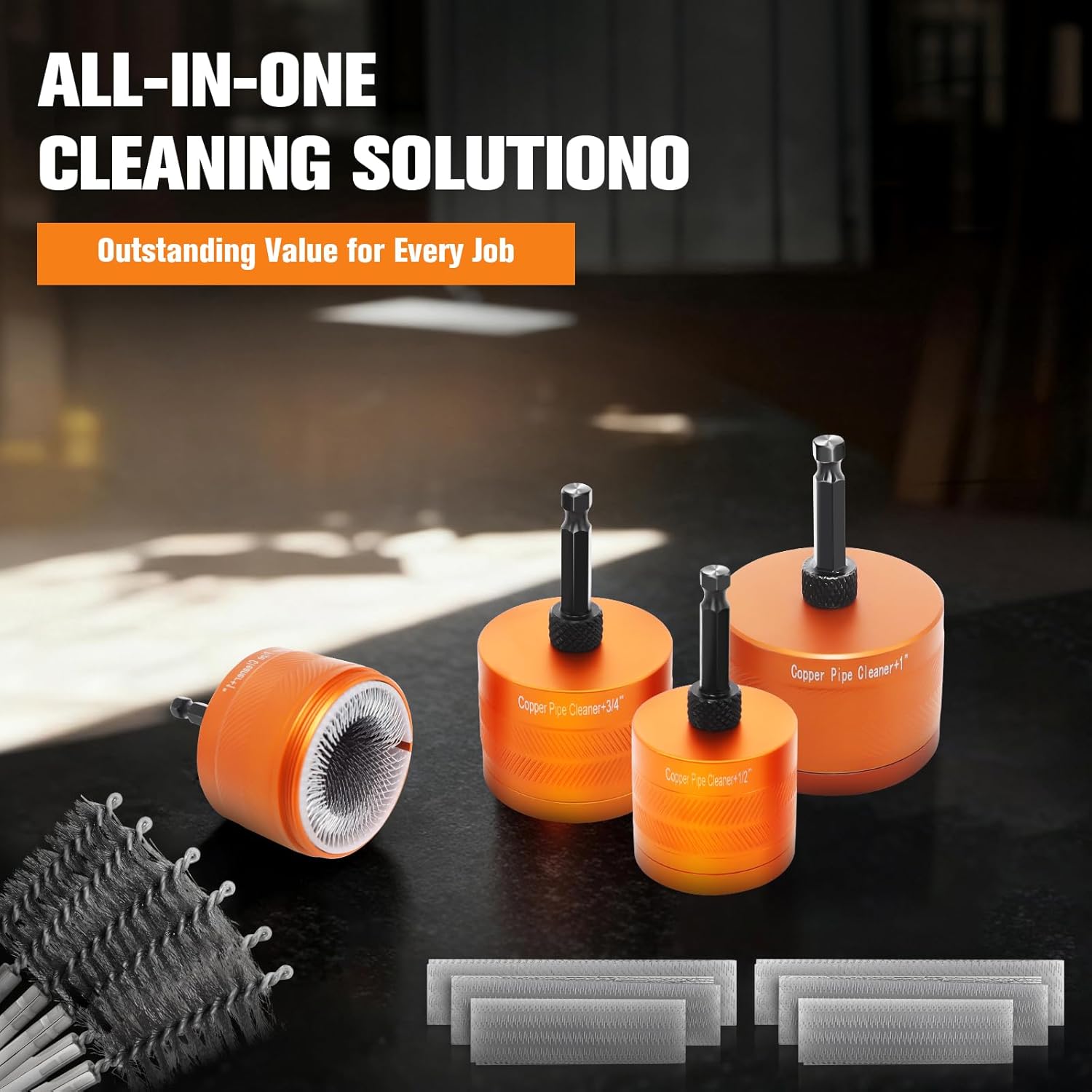 1/2", 3/4" & 1" Copper Pipe Cleaner Set for Drill, with 1/4" Hex Shank, 6 Replaceable Cleaning Blades & 6 Stainless Steel Wire Brushes, Plumbing Tool for Removing Rust, Stains