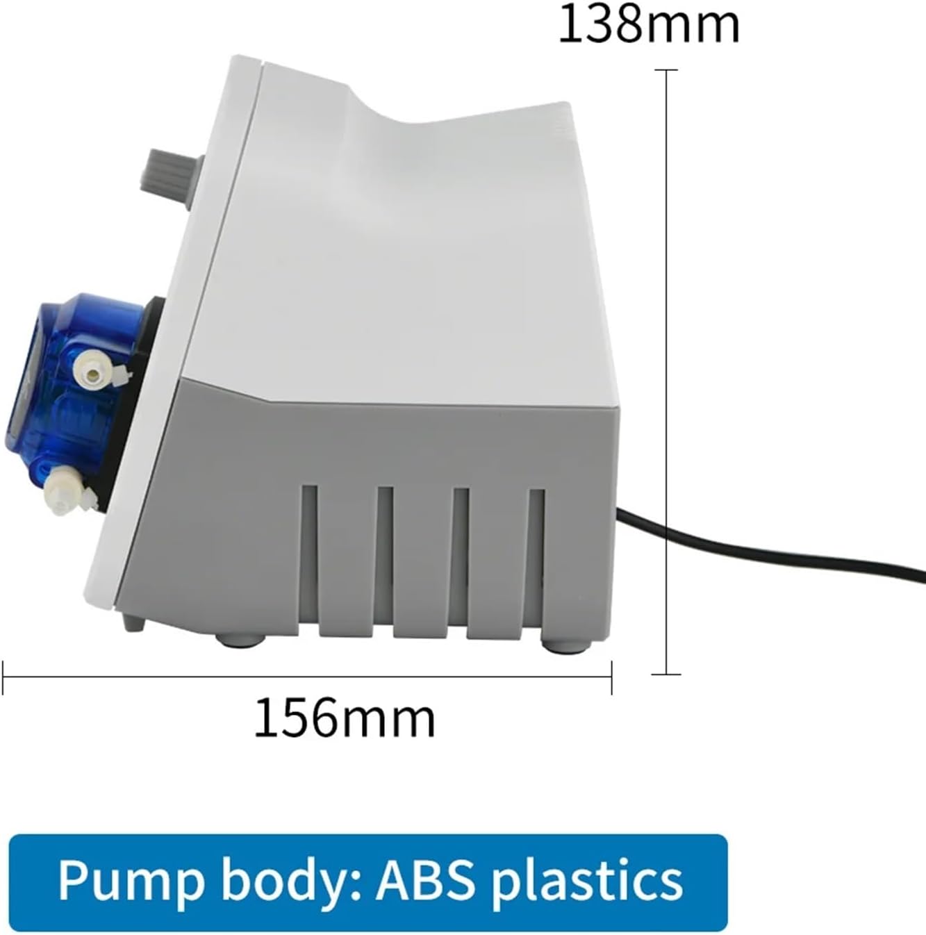 Water PumpsKCPA300 Mini Peristaltic Dosing PumpAdjustable Flow 120ml/min~300ml/minBasic ParametersKCPA300Flow ml/min120ml/min~300ml/minPower adapter 24V 1APower<;24WMotorBrush motorNoise68dB (test environment noise 35dB, the horizontal distance between the test product and the noise meter is 0.5m)Working environment<;80%Weight450gRotating speed<;400rpmControl methodPotentiometerOperating modeSpeed modeSupport functionStart-stop, speed regulation, does not support forward and reverseTubingNorprene 40# ID4mmx OD7.2mm(Lifetime 1000H)Optional accessoriesSilicone tubing:40# ID4mmxOD7.2mm;Supplementary instructionsTheabove maximum flow rate is obtained by testing water at 400 rpm using a pump tube aged for 30 minutes at room temperature (about 25°C), forreference only. The ambient temperature, the material and elasticity ofthe pump tube, the viscosity of the test liquid and other factors will affect the actual flow rate. The thickness of the pump tube will affect the maximum speed of the actual stable operation.Packing listThe hostCables tiesx2US/EU/AU/UK x1Certification of QulificationSilicone tube 1meter-40# ID4mmx OD7.2mmTube DescriptionNorprene 1000H lifetimeVerygood resistance to general chemicals, as well as excellent resistance to acids, alkalis and oxides. The product is transparent and to ultraviolet radiation, so it helps protect sensitive liquids.Working temperature: -60~135Pump head-KHS, Tubing assembly-N40: ID4mm x OD7.2mm3 rotorsGear StructureConnectors-PPEasy to replace tubing assemblyThe liquid only though the pump tube, not the pump body.Adjustable Flow rate: 120ml/min~300ml/minSmall space occupation24V 1A (24W)Various Applications# Laboratory# Scientific Research Institutes# Automatic car washing machine# Biological companies, etc.Dimensions