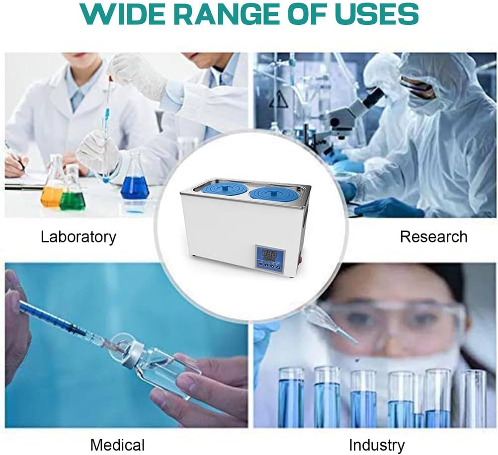Model Number: Digital thermostatic water bath, single hole, double hole, four -hole, six hole are availableSpecifications:Name: digital thermostatic water bathModel: 1hole, 2hole, 4hole, 6holeTemperature rule range: room temperature up to 99.99 °Supply voltage: 110-220V 50-60HzPerformance: 300 W, 600 W, 800 W, 1200 WMaterial of the inner wall: stainless steelEffective volume: 2.5 l, 5 l, 8 l, 15 lConstant temperature resolution: 0.1 ° CTime function: yesStudiog dimensions: 160 x 160 x 130 mm, 300 x 150 x 140 mm, 300 x 300 x 140 mm, 450 x 300 x 130 mmWeight: 3.1 kg, 4.5 kg, 6.35 kg, 9 kgFunction:1. Adjustable in 0.1 ° C steps, the temperature can be set precisely from ambient temperature up to 100 ° C and simply monitored with a built-in timer from 0 to 999 minutes.2. Double digital display, which is covered with a protective frame, guarantees excellent accuracy and performance in order to easily maintain the desired water temperature3. Electric heating tube made of stainless steel, which is immersed directly into the water tank for heat exchange. High heating outputPackage includes:1 x digital water bath1 x stainless steel cover1 x power cable1 x manual