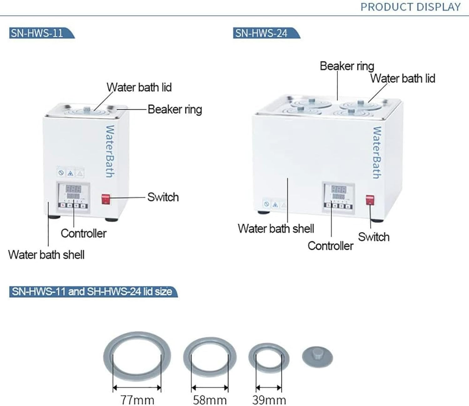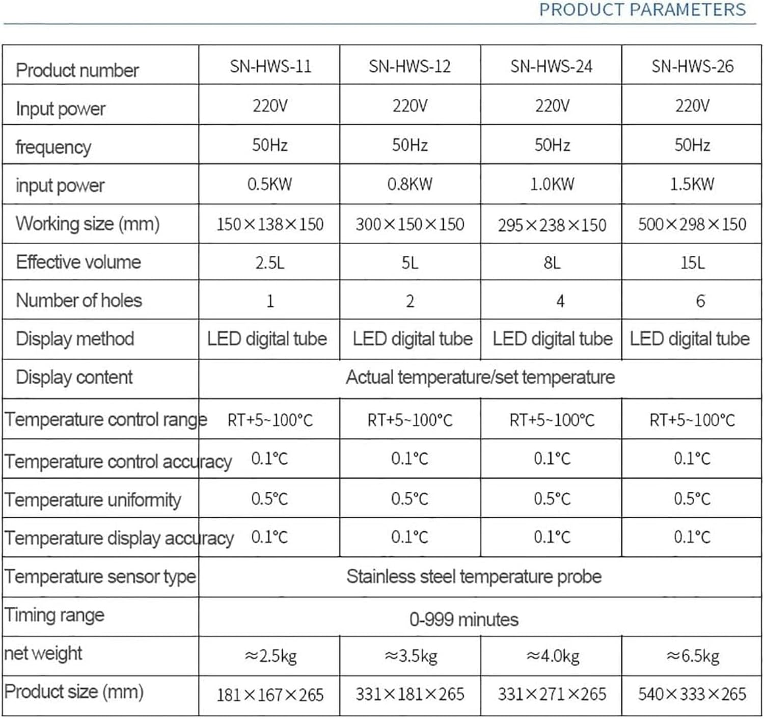 Model Number:The thermostatic water bath is widely used in drying,distillation, concentration, dipping in chemical reagents,pharmaceutical and biological products, can also be used for constant heating water and other temperature test, is a biological, genetic, environmental protection, medicine,aquatic products, health science, biochemistry laboratory,education and scientific research tool.Adjustable in 0.1°C increments, temperature can be set precisely from ambient to 100°C and easily monitored with a built-in timer ranging from 0 - 999 minutes.Dual digital display covered with protective frame, guarantee superior accuracy and performance maintain desired water temperature with simply, user friendly operation, avoiding damage from overflowing water.Single hole, double hole, four hole, six hole are available to choose from to meet different experimental needs.Specification:Model: 1Hole, 2Holes, 4Holes, 6HolesTemperature range: RT +5 to 100°C,Temperature increment: 0.1°CPower: 500W, 800W, 100W, 1500WInner wall material: stainless steelEffective volume: 2.5L, 5L, 8L, 15LTiming function: yesDigital display function: yesLiner size:150x150x138mm, 300x150x150mm, 295x238x150 mm, 500x298x150mmProduct size: 181x167x265mm, 331x181x265mm, 331x271x265mm, 540x333x265mmPackage Contents:1 x Digital water bath1 x Stainless steel cover1 x Power cord1 x Carrier1 x PP cover ring1 x ManualNote:1.This product is taken in kind,Due to factors such as light and equipment, there are some color differences.2.Due to the different measurement gestures, the dimensions may vary.