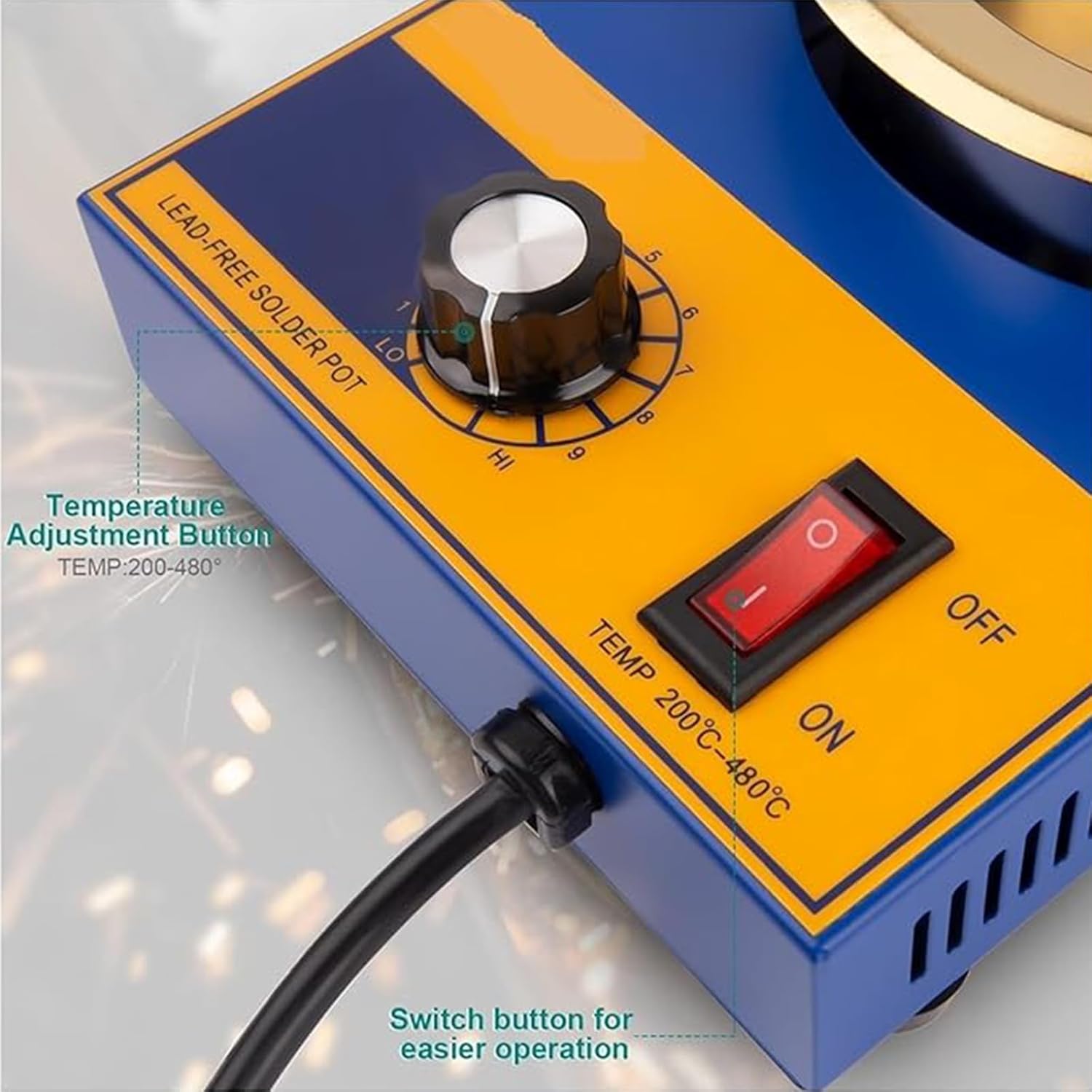 Features: 1. Adjustable temperature 2. Three-dimensional heat dissipation hole 3. Anti-slip shock absorbing foot pads Specification: Product name: Solder furnace Tin pot material: stainless steel titanium-plated tin pot Voltage: 220V Power: 300W Temperature range: 200-480°C Tin pot size: φ100mm Dimensions: 139*210*35mm Product color: blue Product weight: 1.19kg Notice: Due to the different colors of brightness and light, the actual color may be slightly different from the picture. Due to manual measurement, allow errors of 0-2 cm. Thank you for your understanding. If you have problems using our products, please contact us. We are happy to have the opportunity to learn from your experience and we will do better.