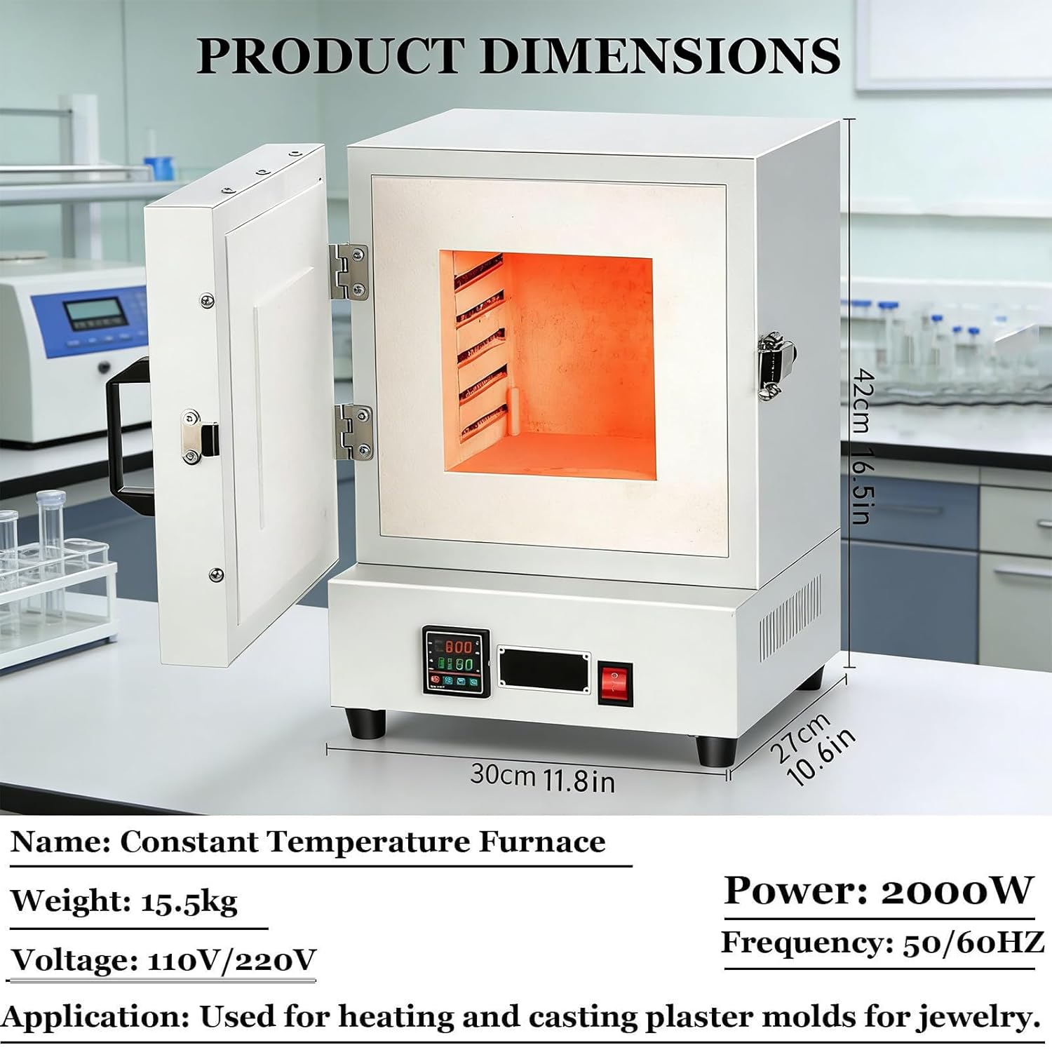 Introducing our Laboratory Small Electric Furnace, designed for professionals seeking reliable performance in their heating applications. This electric furnace incorporates a four-sided surround heating technology, engineered to promote even heat distribution for consistent processing results. With adjustable temperature control from 0 to 1150 ℃ and a clear digital display, it supports a wide range of experimental and crafting tasks. The 2000W heating system with a robust heating element enables efficient heating suitable for various projects.A sealed furnace door design contributes to improved heat retention and energy efficiency. The internal chamber (16x16x13.8 cm) provides ample space to accommodate multiple gypsum molds simultaneously, aiding in batch processing workflows. Ideal for researchers, educators, and artisans, this electric muffle furnace serves as a practical tool for applications requiring a stable high-temperature environment.Featuring a compact design (30*27*42 cm, 15.5 kg), it fits conveniently into most workspaces without compromising on chamber capacity. Please note that product appearance may vary slightly due to monitor settings, and minor measurement variations can occur.