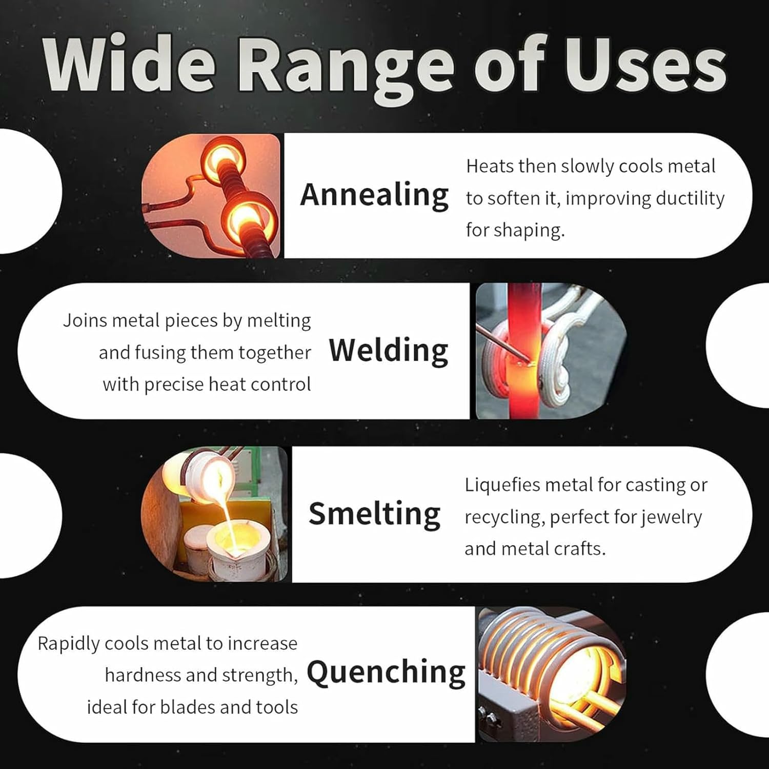 High Frequency Induction Heating Machine 15KW Equipment Furnace are widely used in industries requiring heat source equipment, such as metal processing, hardware, home appliances, and automotive, for processes such as hot forming, welding, quenching, melting, annealing, and thermal matching.High Frequency Induction Heating Equipment can be customized to meet different application requirements, including heating and insulation time, as well as stacking and repeated heating.Specifications:Name: High Frequency Induction Furnace 15KW Power: 15 kWVoltage: 110VOutput Frequency: 30-100HzTemperature Range: 40°C-2000°CHeating Current: 200-600ACooling Water Flow Rate: 0.2 MPa 6 L/minWater Temperature Protection Point: 40°CWeight: 26 kgPackaging: High Frequency Induction Heating Machine 15KW * 1 Foot Switch * 1 Coil * 2 Manual * 1 Note: If you have any questions upon receiving the goods, please contact us promptly, and we will provide you with a satisfactory response. Induction Heater Furnace machines require connection to a water tank for cooling during operation. If cooling is not implemented promptly, it will not only affect the machine's performance and power but may also burn out components and damage the machine.