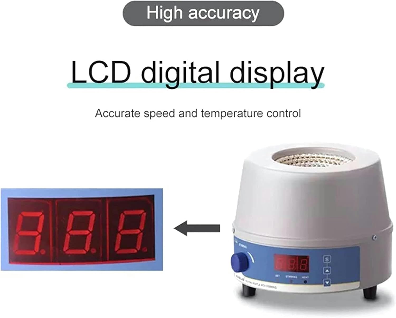 Product Description: 【E-glass fiber liner】adopts E-glass fiber as insulating material, which has the characteristics of high temperature resistance, fast heating, large heating area, etc. 【Precise temperature control with temperature probe】 With a temperature transfer device, the experimental temperature control is more accurate 【Operation panel】Intelligent temperature control instrument, accurate reading 【Heating core】 Fast heating, high temperature resistance, good thermal insulation effect 【Insulation jacket】 One-time pressure molding, electrostatic wall plastic technology Product Properties: Model: HMSC Name: Heating Magnetic Stirring Digital Display Electric Heating Mantle Capacity: 2000ml Function: heating, digital display, magnetic stirring Heating power: 100- 2400W Heating temperature: room temperature to 300°C