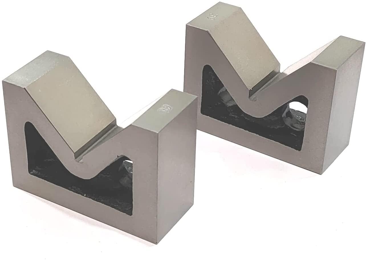 These precision V-blocks are supplied in pairs and are expertly seasoned to prevent distortion, ensuring reliable performance and accuracy. Each block measures 3 inches (75 mm) in length, 1-1/4 inches (31 mm) in width, and 2-3/16 inches (56 mm) in height. They feature a 90-degree V-shaped groove that can accommodate round stock up to 2 inches (50 mm) in diameter. The blocks are meticulously machined to be square and parallel, guaranteeing precise alignment and consistency. Each set is matched for uniformity, making these V-blocks an essential tool for securely supporting cylindrical workpieces during machining operations. The total weight of the pair is 5.11 lbs (approximately 2.322 kg).