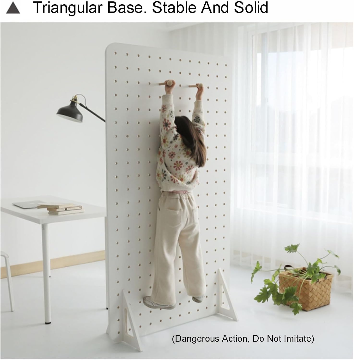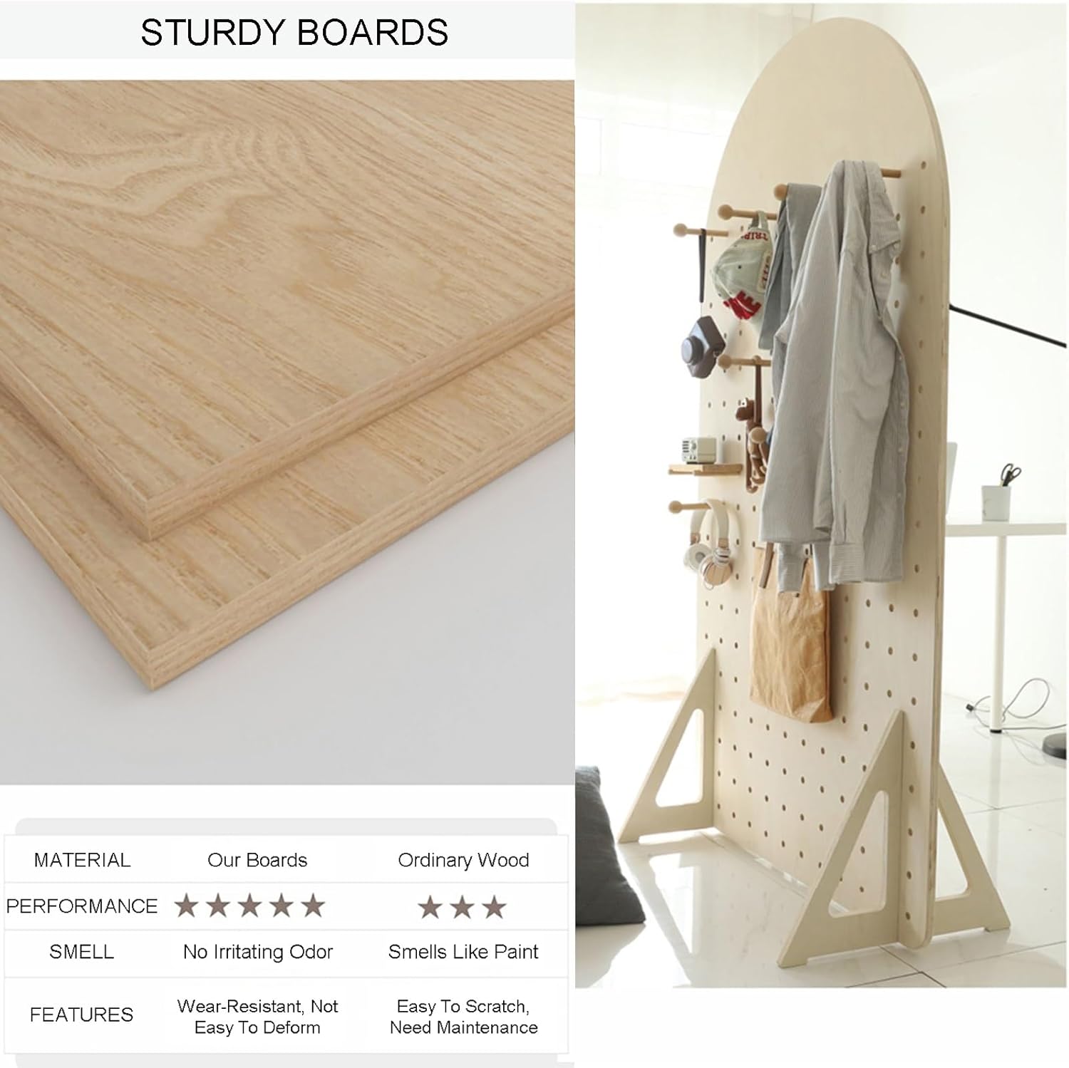 Our wooden Pegboard are foldable and made from multiple panels of the same size. You can also fold our room dividers completely when not in use, requiring very little storage spaceFEATURES:1.Room divider screen offers enhanced privacy2.Screen can be adjusted 360°flexibly3.Versatile for hanging jewelry, accessories, tools and other items4.Standardized spacing holes are suitable for different hooks5.Practical folding design allows for easy storage and transportationSPEICIFICATIONProduct name:peg board room divider/pegboard partition screen/Room divider screen/Room partition screenColor: White , Wood colorMade of: Solid woodSize of single fan(H x W):160x80cmQuantity: single PanelsInstallation:No installation required,Ready to use after unfoldingApplication scenarios:stores, bedroom, office, trade show booths,Kindergarten, children's room, doorway, boutiques, terrace, kitchen, balcony, studyPACKAGE INCLUDESingle panel x Peg board room divider and Accessories(The package only includes room dividers and accessories, and other items used for display in the picture are not included in the shipping list)WARM REMINDER:1.The screen needs to be folded into a "V" shape to stand stably. It can also be folded and placed at will2. Due To Manual Measurement, There Is 1-2cm Error Compared To The Actual Object3.There May Be A Slight Color Difference Between The Recording Resolution And The Screen, Please Refer To The Actual Color