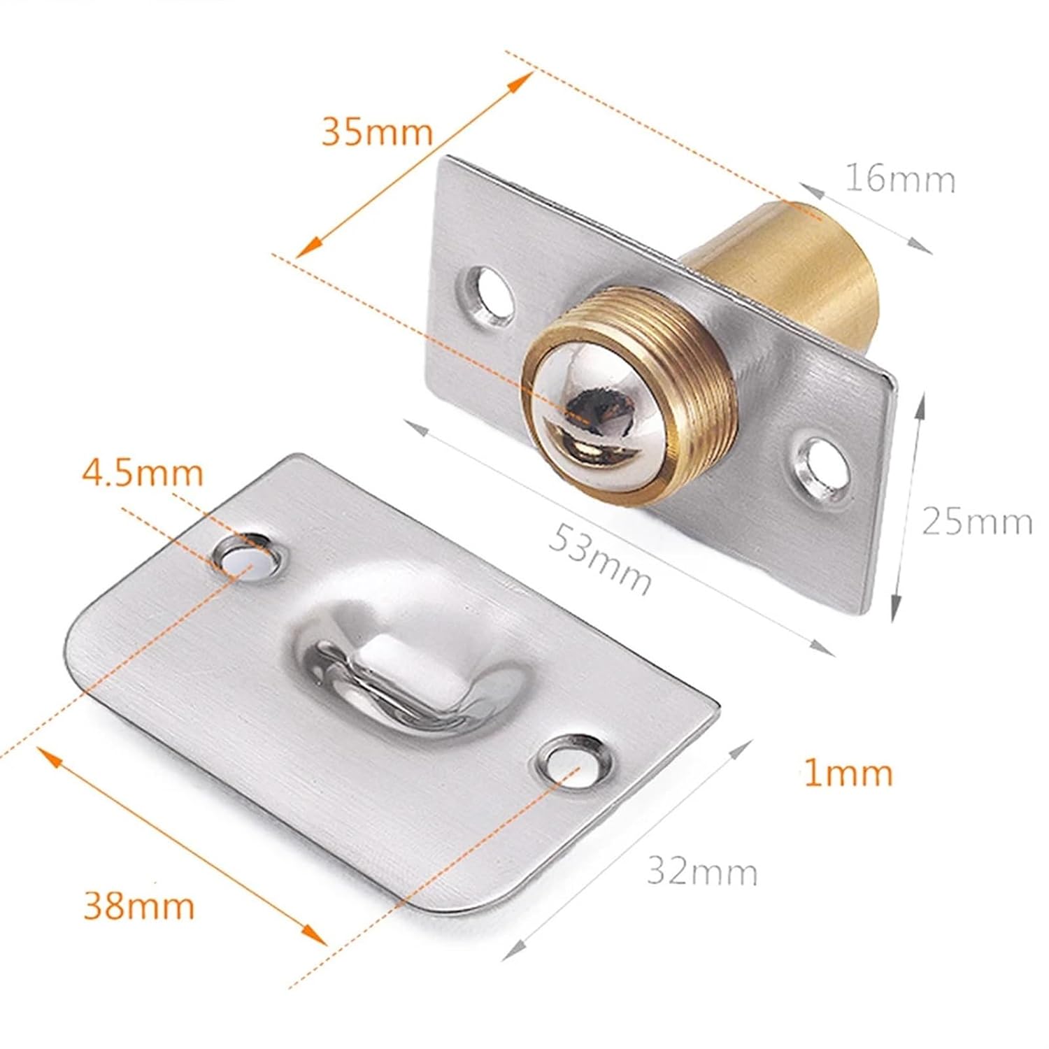 Precision BallsFeatures:**Closet door ball catch is generally used on invisible doors where a latch is not used or needed.*The ball catch is mounted on the top of the interior door recessed in a hole drilled on the top surface.*Adjustable Ball Tension: Dual adjustment ball bearing door catch for perfect strong tension to accommodate the exact amount of hold you need in any situation.*Widely used for holding doors without a latch closed, such as swinging doors, double closet doors or French doors.Specification:Material: Stainless steelColor: SilverPackage Contents:2 x Door catch4 x ScrewsNote:1. The real color of the item may be slightly differe