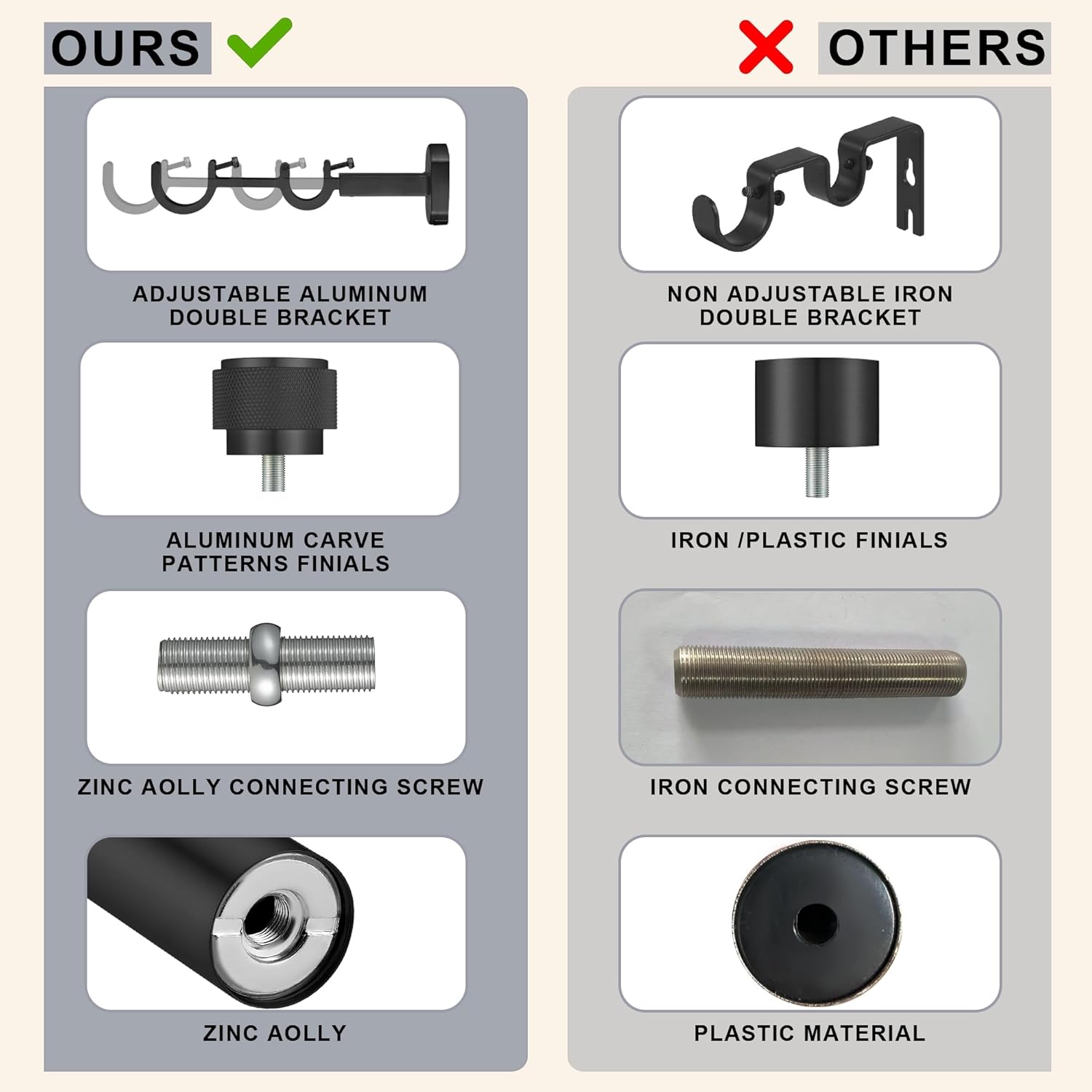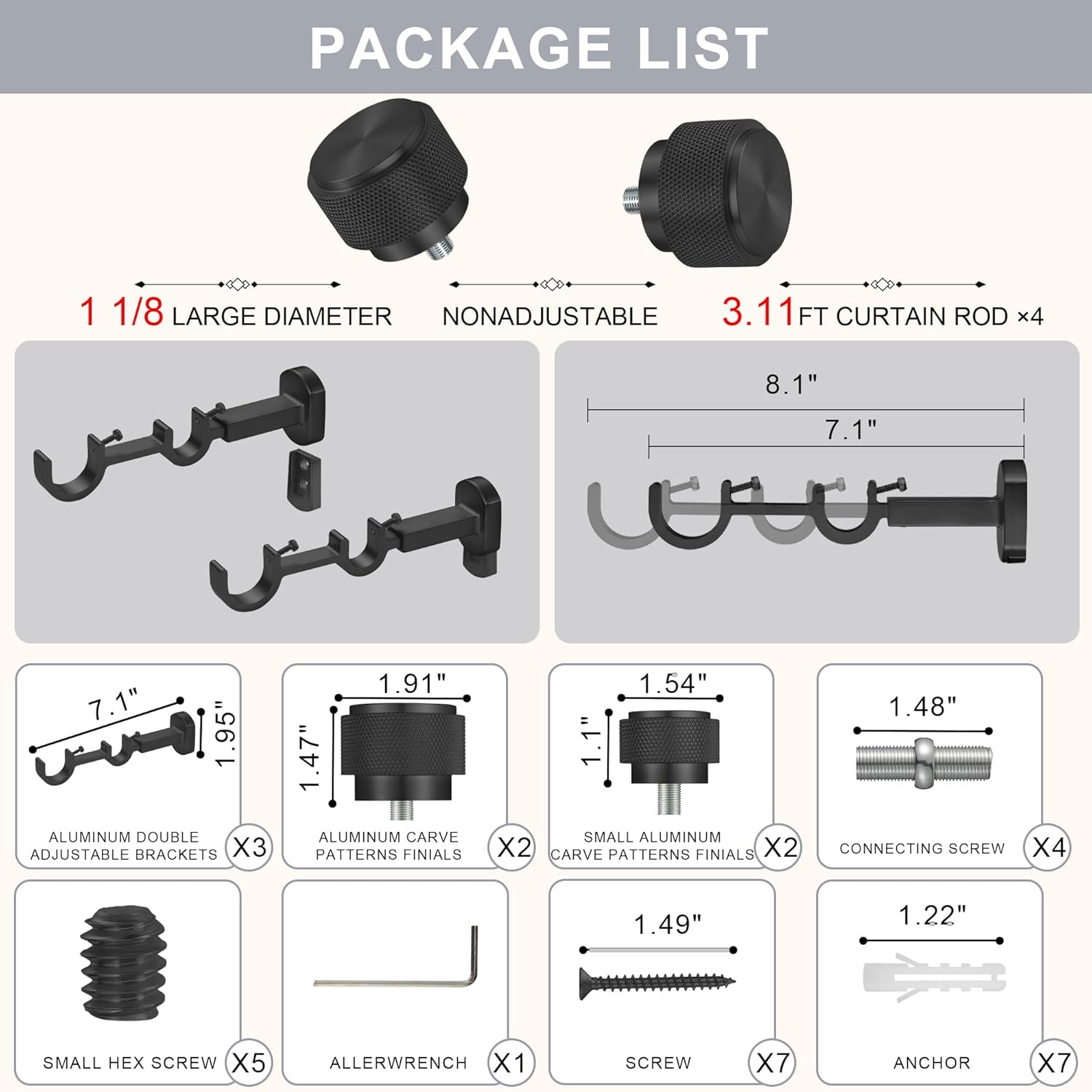| Included Components | Anchor, Bracket, End Cap, Rod, Screw |