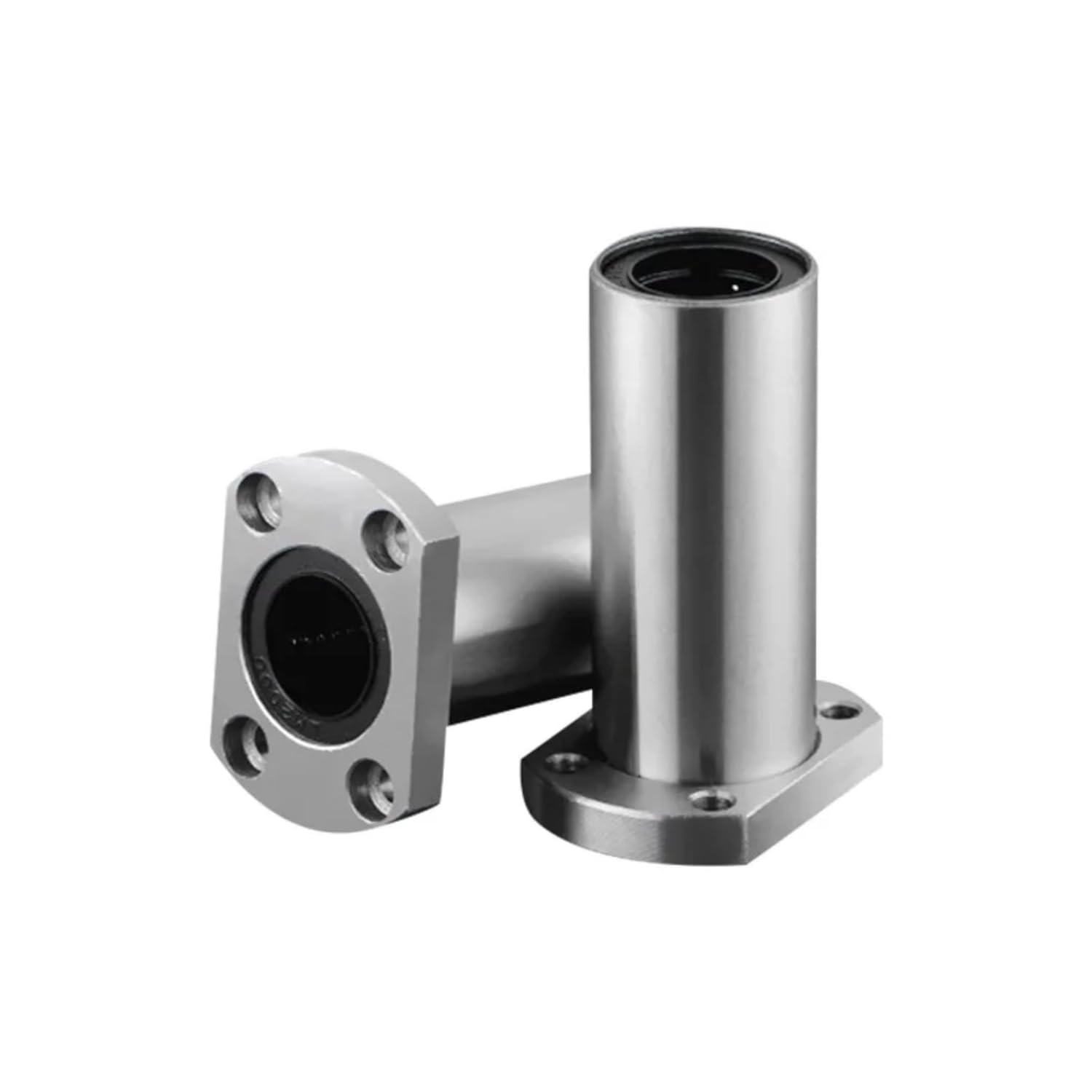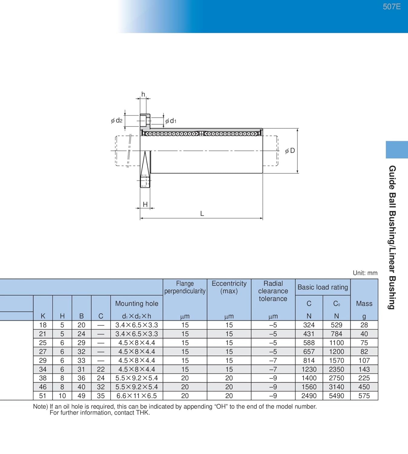 Linear Bushing model LM is a linear motion system used in combination with a cylindrical LM shaft to perform infinite straight motion. The balls in the loaded area of the nut are in point contact with the LM shaft. This allows straight motion with minimal friction resistance and achieves highly accurate and smooth motion despite the small permissible load. The nut uses high-carbon chromium bearing steel and its outer and inner surfaces are ground after being heat-treated. The Linear Bushing is used in a broad array of applications, such as slide units of precision equipment including OA equipment and peripherals, measuring instruments, automatic recorders and digital 3D measuring instruments, industrial machines including multi-spindle drilling machine, punching press, tool grinder, automatic gas cutting apparatus, printing machine, card selector and food packing machine. [Interchangeability] Since the dimensional tolerances of the Linear Bush's components are standardized, they are inter- changeable. The LM shaft is machined through cylindrical grinding, which can easily be performed,and it allows highly accurate fitting clearance to be achieved. [Highly Accurate Retainer Plate] Since the retainer, which guides three to eight rows of balls, is integrally molded, it is capable of accurately guiding the balls in the traveling direction and achieving stable running accuracy. Small-diameter types use integrally molded retainers made of synthetic resin. It reduces noise generated during operation and allows for superb lubrication. [Wide Array of Types] A wide array of types are available, such as standard type, clearance-adjustable type, open type,long type and flanged linear bushing, allowing the user to select a type that meets the intended use The LM shaft of the Linear Bushing needs to be manufactured with much consideration for hardness,surface roughness and dimensional accuracy of the shaft since balls roll directly on it.THK manufactures dedicated LM shafts for the Linear Bushing.