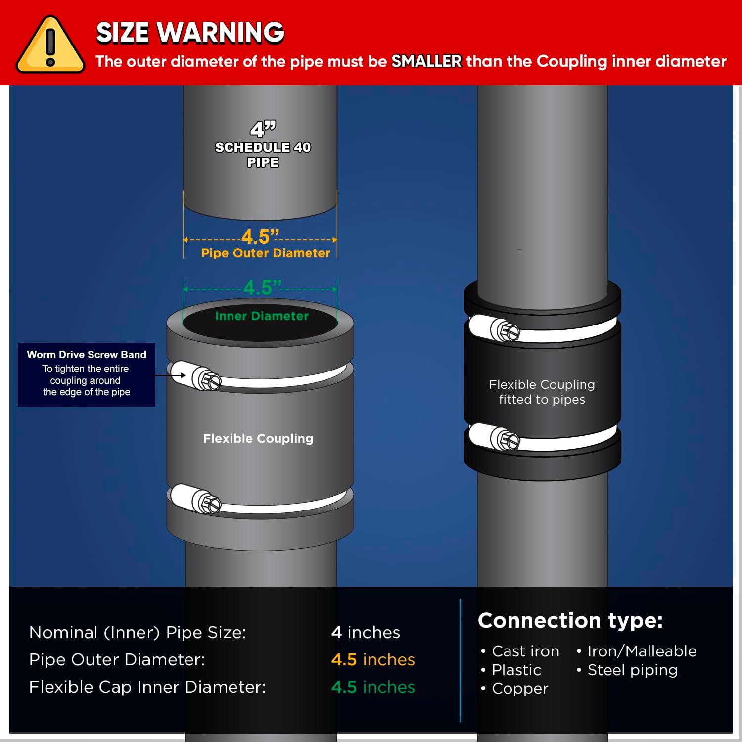 Supply Giant Flexible Couplings have found wide acceptance among sewer and plumbing contractors and municipalities because of their quality and ease of installation. pipe couplings and adapters are used for all types of in-house and sewer connections: drain, waste, vent piping, house-to-main, repairs, cut- ins, conductor, roof drains and increasers-reducers. Manufacturing thousands of different flexible coupling types, Supply Giant has the right solution for most applications. Made (PVC), the flexible couplings are strong, resilient and unaffected by soil conditions. ⚠ California Proposition 65 Warning: This product is known to the state of California to cause cancer, or other reproductive harm. For more information, go to www.p65warnings.ca.gov. ⚠ California Proposition 65 Warning: This product is known to the state of California to cause cancer, or other reproductive harm. For more information, go to www.p65warnings.ca.gov.