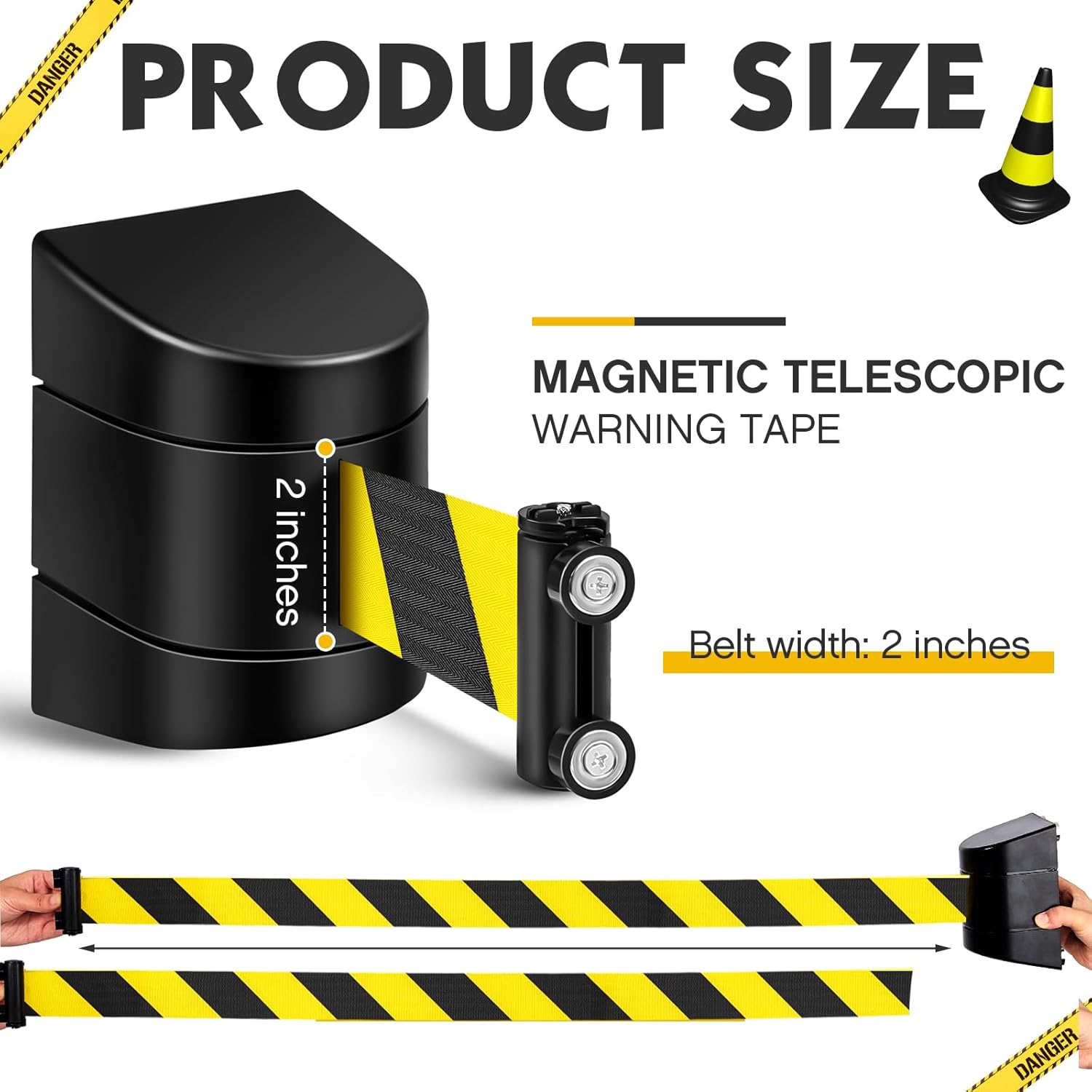 Features: Convenient single pack: Each package comes with 1 crowd control barrier, making it convenient. Whether you need one or multiple units, you can order according to your specific needs, ensuring a tailored solution for crowd control. Innovative design: This retractable barrier belt comes in a black casing with a black and yellow striped tape. The vibrant color combination ensures the barrier is attention grabbing in various settings, thus enhancing its preventive abilities. The appealing design also complements any decor, making it suitable for a wide range of venues. Specifications: Material: ABS plastic Color: black, yellow Size: 16.4 feet long Package includes: 6 x Magnetic retractable wall barrier Notes: Manual measurement, please allow slight errors on size. The color may exist a slight difference due to different screen displays. Warning: This product contains magnets. Keep away from children and pets.