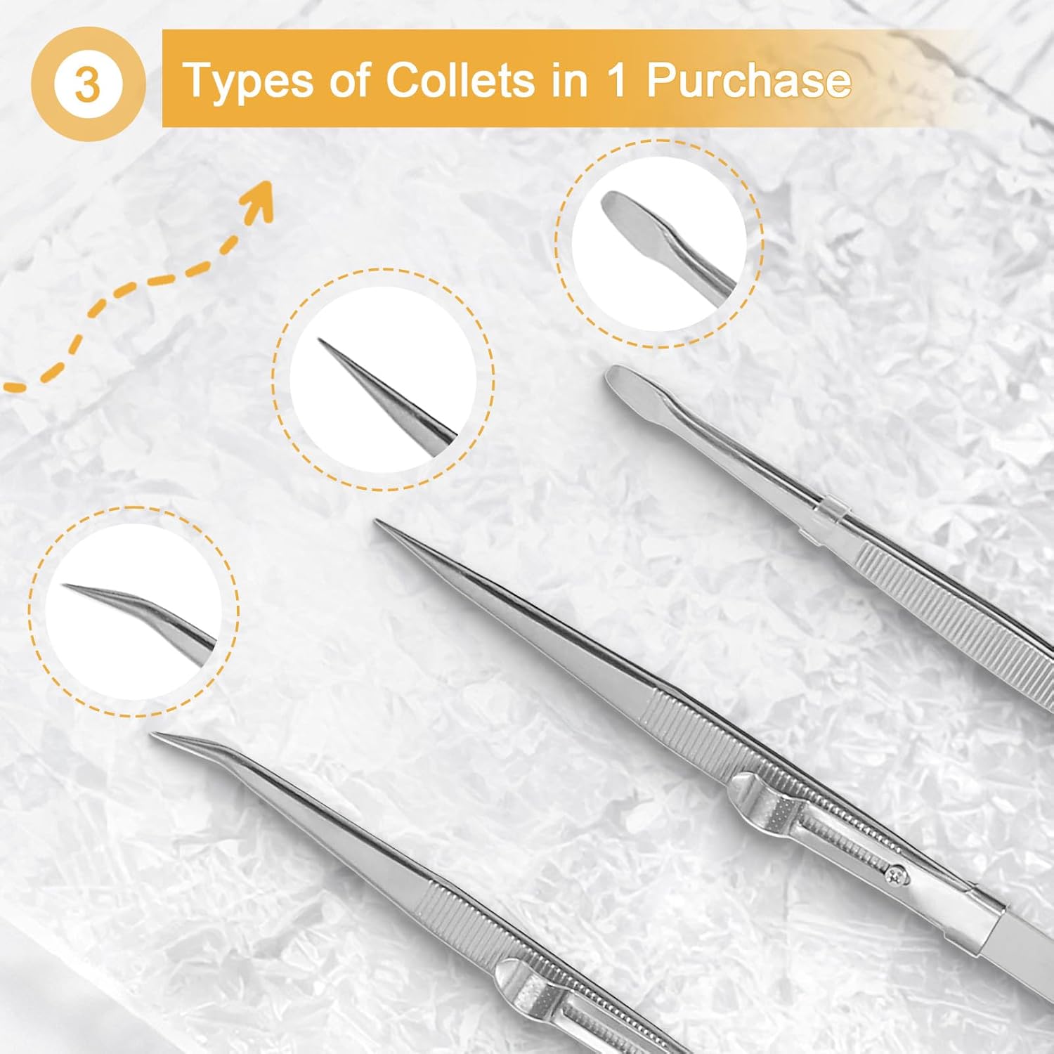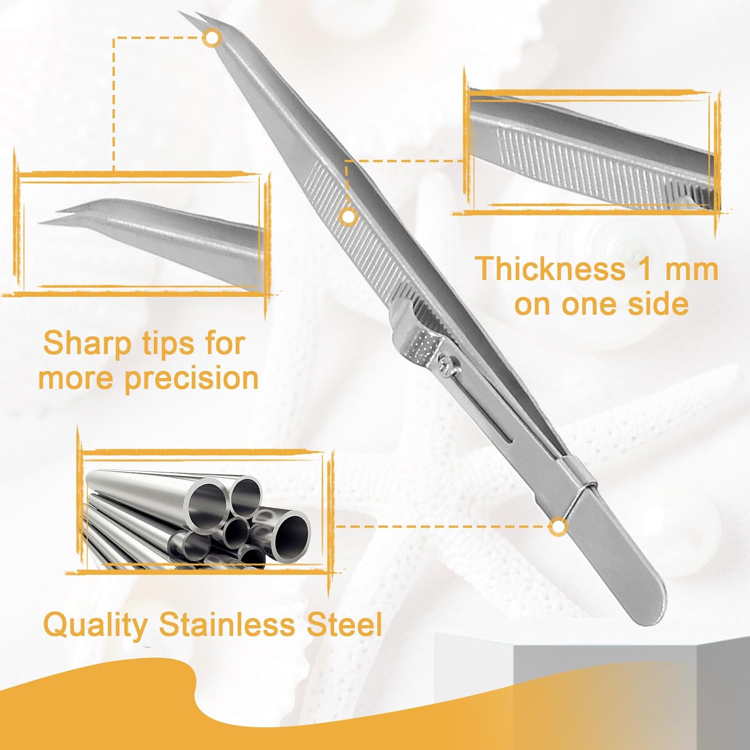 Product Specifications: Material: Stainless Steel Flat Head Tweezer Length: 5.9 Inch / 150mm Straight & Curved Tweezer Length: 6.3 Inch / 160mm Product List: 1 x Flat Head Tweezer 2 x Curved Tweezers 2 x Straight Tweezers Note: Light shooting and different monitors may cause the items in the pictures to be slightly different in color from the real thing. Please allow a moderate margin of error due to manual measurement.
