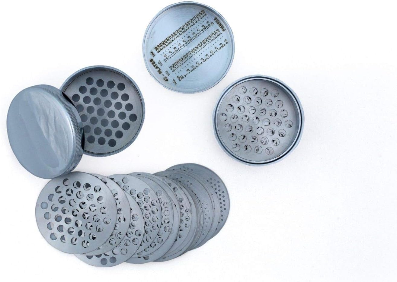 XCLUSIVE DIAMOND SIEVE 47 MM SET OF 42 PLATES JEWELRY TOOL MEASURE GEMSTONES 47MM diameter body and 42 sieves with almost double holes (000 to 20,with half numbers), both made with extra hard mix metal so the measurement remains same for long. Its huge size with 42 plates and extra holes make assorting of large lot of any size of diamond ,extreme fast.