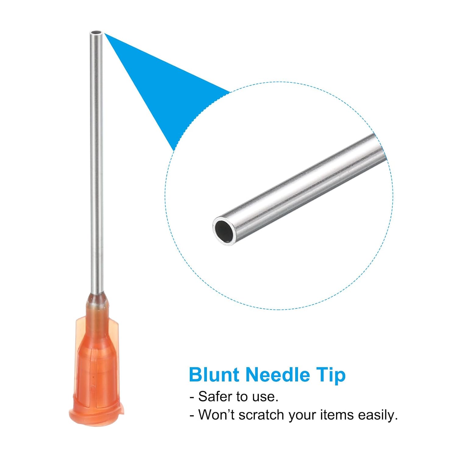 Dispensing needle tips are widely used in industrial or household applications for precise dispensing and aspiration of liquids, making them suitable for hydroponics, craft making, experiments, filling ink, oil and other liquids, electronic components, oral care, and more.SpecificationGauges: 15GaMaterial: Plastic and Stainless SteelColor: OrangeOverall Length: 55.4mm / 2.18inchOverall Diameter: 7.5mm / 0.3inchNeedle Tip Length: 38.1mm / 1.5inchNeedle Tip Outside Diameter: 1.8mm / 0.07inchNeedle Tip Inner Diameter: 1.4mm / 0.05inchPacking List: 50Pcs x Dispensing Needle TipsAdvantage1. The PP dispensing needle tip base is lightweight and reusable, the needle tip tube is made of lightweight and reusable stainless steel which can resist high temperatures and corrosion.2. The dispensing needle tip seat features double screw locking which not only makes it fitter, preventing glue leakage but also allows you to install and dismantle it easily.3. Blunt needle tip is safer to use and won't scratch your items easily. InstructionInstall the dispensing needle tip in an appropriately sized container.NOTE: Please confirm the needle tip size before purchasing. This item is a blunt tip that can not be used for any human injection.