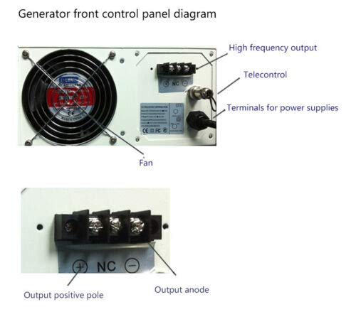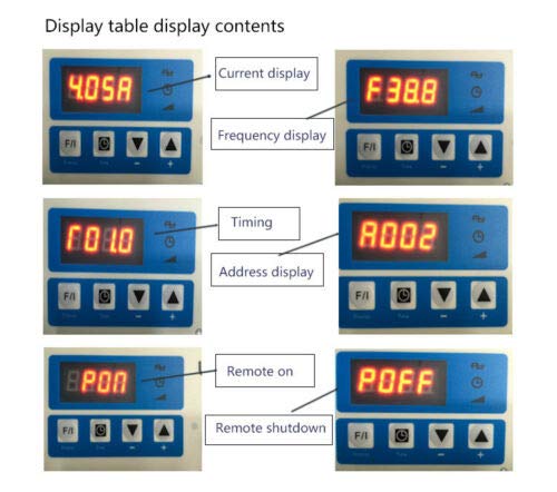 1.Power switch: turn on or cut off input power; ON is ON and OFF is off. If the switch is in ON position and the switch-in lamp is on, it indicates that the input power is normal. 2.Power regulator potentiometer: small on the left and large on the right. The power can be controlled by adjusting this potentiometer. This is optional, the general dual-frequency model or the need for 485 communication model, power regulation with adjustment and adjustment-key to complete. You don't need this accessory. 3.High-frequency output terminal: left is positive, right is negative, can not be reversed. If connected, there may be leakage or no output. 4.PLC remote terminal: this terminal is optional, with two lines of output, only when two lines of the terminal are short-circuited. 5.Power plug and power cord: connect to the power supply through the plug, and supply power to the generator. 6.Fan: air cooling for the internal components of the generator. To ensure the reliability of the components. 7.Product nameplate: representing the main electrical parameters of the machine, frequency, power, input voltage three parameters, note that the use conditions must be the same as the specification identified by this nameplate, otherwise the generator will be damaged. As shown, the machine model is 1500WN 40K with an input voltage of 180-265V. 8.F- / I key: display switch key; can be displayed in the current, frequency, mode, address code four display interface switch; boot default display current. 9.Trigger / stop key: only valid in timing mode. Tap this key to stop the timing while the machine is working, and then press this button to rework. 10.Adjust / adjust-key: on the model without adjusting knob, when the current is displayed, the /-key can adjust the current size; when the address is displayed, the address code value can be adjusted, and when the timing is displayed, the timing time can be adjusted.11.In mode display, three modes can be swith.