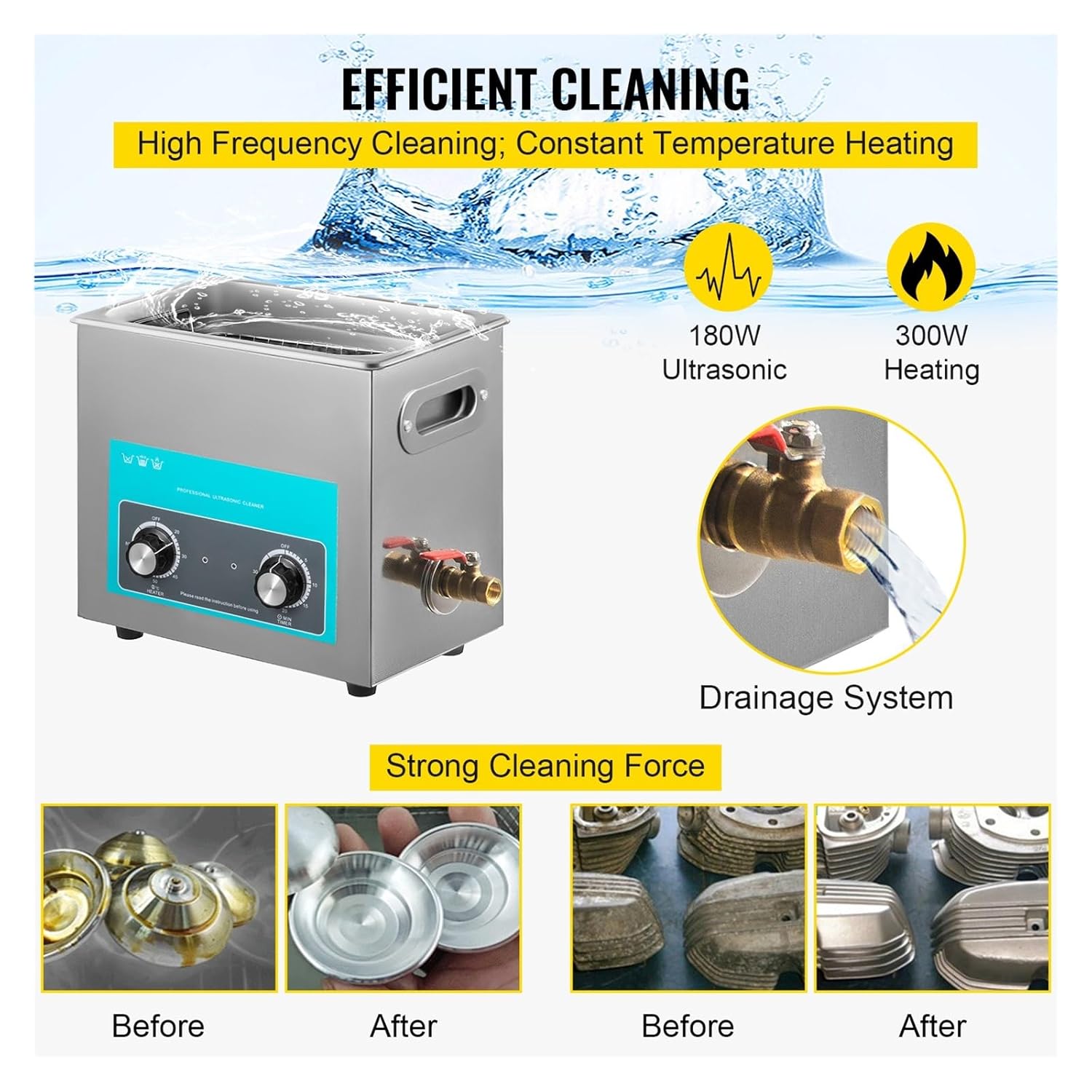 6L Electric Ultrasonic Cleaner Portable Washing Machine Lave-Dishes Ultrasound Home ApplianceProduct Description 6.5L Ultrasonic Cleaner with Heater This is a high efficiency ultrasonic cleaner used for daily or professional cleaning works. It will emit 40KHZ ultrasonic wave to deeply wash dirt on your valuable's surface, longhole, crevice and shelter. With heating & timing function use only tape water if needed some solutions your things can be cleaned thoroughly in minutes No scratching created great for business, commercial or home. Note: Since our 6.5L ultrasonic cleaner with heater has been upgraded & updated the product in new or old appearance will be delivered randomly Heating Working AdjustmentAmazing Cleaning FunctionUserFriendly DesignTough Equipment ToolsKey Features Premium Stainless Steel 304 stainless steel tank better to resist alkali solution organicinorganuc acid than normal SUS200 products 201 stainless steel cover, made up of several crafts to ensure no water leakage, heat-proof & antirust Powerful 40KH Frequency Industriallevel transducer create more cavitation quantity than 28Kh products Do well in cleaning stuffs with complex shape holes longtime stians. Also, it will cause much lower nouse than ultrasonic waves nearly 20KH. Large 6.5L Tank & Basket Tank Capacity 65L; Large Basket Material: Stainless Steel; With a ball-shaped jewelry cleaning basket, use tap water for general cleaning, can also add 5-10 ML detergent into water to enhance wash result if needed. Adjustable Heat & Work Time Actual 180W cleaning work time030 minutes adjustable; Also can heat the liquid between 20-80 (adjustable). Micro-chip controlled machine, with 2 mechanical knobs to adjust functions.Get brand new valuables after it finished. Elaborate & Convenient Details Handles at both side for easier movement And the top lid is to prevent heat loss and reduce noise Right side water drain connector with valve to control water outlet speed 4 bottom rubber feet to keep stability Versatile Cleaning Field Suitable for many fields to useJewelry earrings necklace, diamond; Glasses: sunglasses, optical lenses, contact lenses: blades, dentures, tattoo guns; Dishware: Forks, Knives, Spoons, valves etc. Specifications Input: 220Ultrasonic Frequency: 40KHTank Capacity: 6.5LWorking Time: 0-30 MinutesCleaning Power: 180WHeating Function: 200W(Power); 20-80 Heating TemperatureProduct Size: 13x7.1x11.2"Package Content 1 x Ultrasonic Cleaner1 x Cleaning Basket1 x Jewelry Cleaning Ball1 x Water pipe1 x Stainless Steel Cover1 x Power Supply1 x User ManualFeatures & Details PREMIUM MATERIAL Ultrasonic Power 180W; Frequency: 40KH; Heating Power: 200W; 304 stainless steel tank, anti-corrosion to different kinds of solutions. Anti-rust with longer service time. Great product to clean your things, get rid of heavy manual works.HEATING & WORKING Support adjustable of heating temperature20 80 and working time0-30 minutes). Heating can help decrease the adhesive strength of oil and wax to certain stuffs, save time & labor for youAMAZING CLEANING Strengthened 40KH ultrasonic power works great to remove oil wax stain in holes, surface, crevice etc. 6.5L big tank to hold more goods a time and it is low noise on use. Never disturb your other works.USER-FRIENDLY DESIGN- This tabletop ultrasonic washer is designed for better customer use: portable handle, heat dissipation, anti-slide rubber feet, lid and knobs to adjust functions. for industries of lab, food, biology, medicine, agriculture or daily stuff cleaning.==========