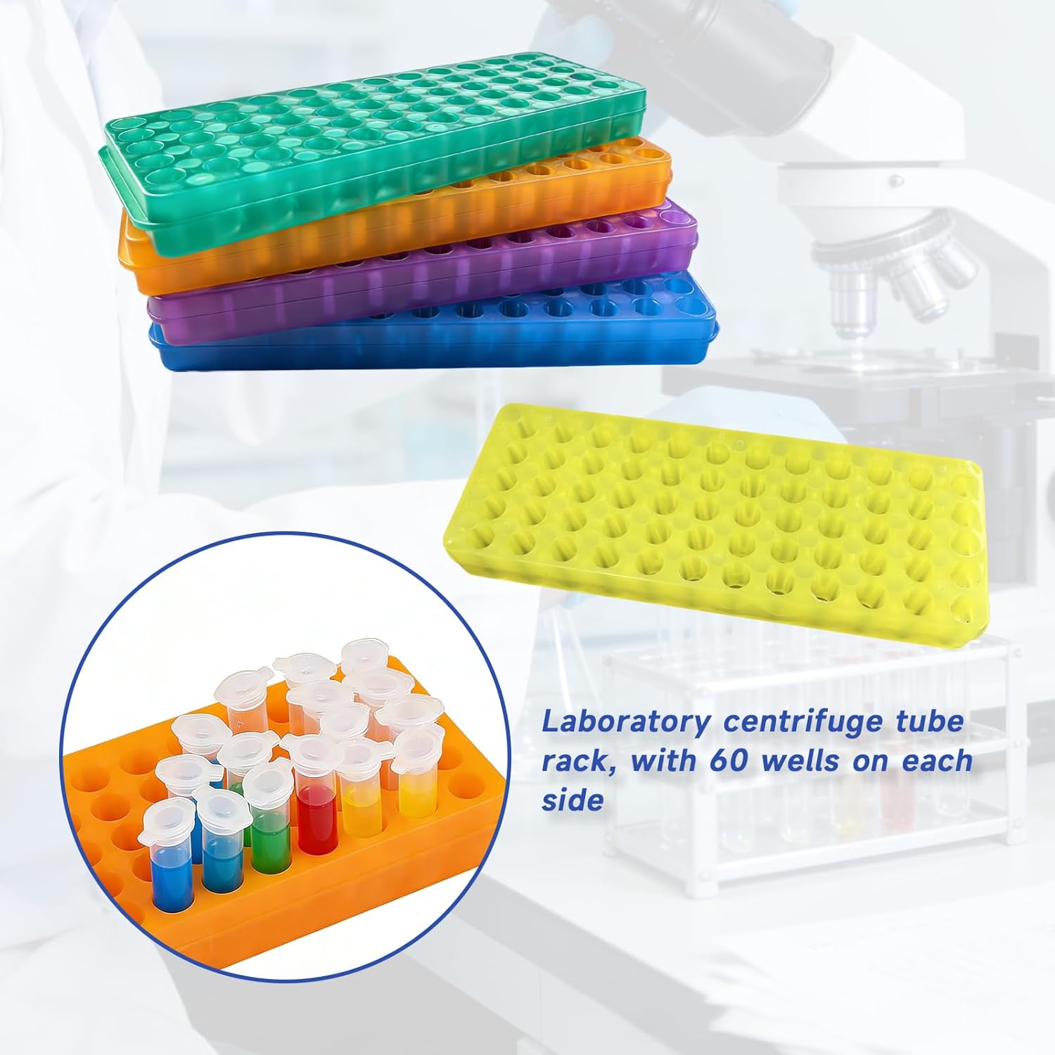 Our Service: If you encounter any problems, please be sure to click on "Contact Seller" on your order page Button to send us a message. We will handle it for you as soon as possible! Product Specifications Product Name:60 Well Centrifuge Test Tube Holder Material: Polypropylene (PP) Color: 6 colors, purple * 1/transparent * 1/lemon yellow * 1/green * 1/blue * 2/orange/* 2 Size: Approximately 8.07 x 2.95 x 0.79 inches (205 x 75 x 20mm) Packaging: 8 packs This microcentrifuge tube holder adopts a dual hole optimized design, greatly saving laboratory and household space. It can orderly store more test tubes in a limited area, creating a clean and efficient working environment. The product is made of thickened environmentally friendly PP polypropylene material and has a large storage capacity. The design is compact and efficient, reducing the number of shelves occupied and improving overall efficiency.