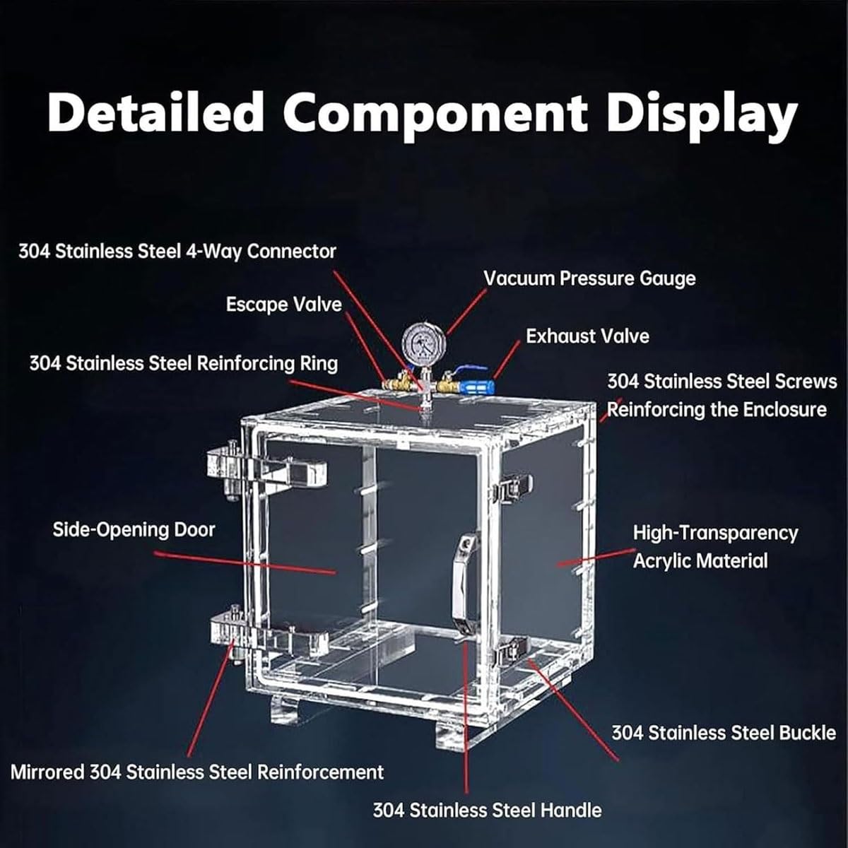 What an efficient and reliable solution for degassing, drying, and moisture-proof storage! This sturdy acrylic vacuum chamber combines strong sealing, precise control, and practical design to perfectly support your workshop and laboratory needs.Features:24-hour airtight vacuum seal up to -29 inHg.20/30mm thick high-strength transparent acrylic.Square design for space efficiency and mold fit.Dual two-way valves with precise pressure gauge.Multi-use for degassing, drying and moisture-proof storage.Specifications:Name: Acrylic Vacuum Degassing ChamberMaterial: Acrylic SheetThickness: 20mm/0.79inch, 30mm/1.18inchNegative Pressure (MPa): -0.1Positive Pressure (KPa): 15Product Size:20×20×20cm/7.9×7.9×7.9inch30×30×30cm/11.8×11.8×11.8inchPackage Size:30×30×30cm/11.8×11.8×11.8inch50×50×40cm/19.69×19.6915.75inchGross Weight: 12kg, 35kgPackage Included:1 × Vacuum Degassing ChamberNotes:1. Please allow the slight color difference caused by the shooting light and 1-3cm error due to manual measurement.2. If you have any questions please contact me and I will reply you within 24 hours
