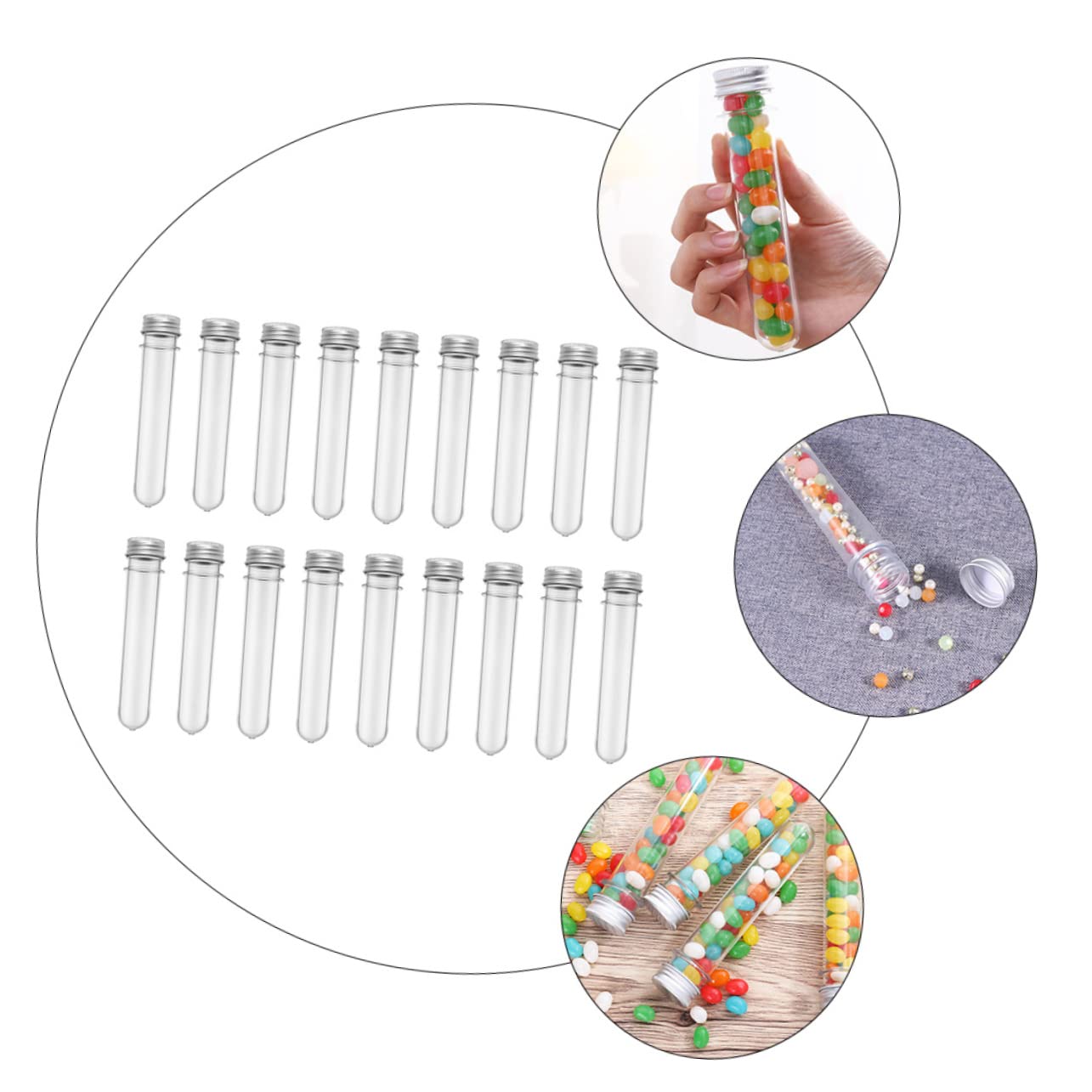 Package List 1 x Set 50Pcs Test Tubes Features -Material: PET, aluminum Candy Tube. -Size: About 14.00X2.50X2.50cm/ 5.50X0.98X0.98in PET Tubes. -Color: Transparent Storage Tubes. - multipurpose test tubes can be used as decoration, containers, experiment tool, etc Multipurpose Test Tubes. - Manufactured with aluminum and PET materials, and practical enough to use Plastic Tube Bottles. - Suitable for storing liquid, candy, bath salt, pill and other items Test Tube Bottles. - External assures a tight, suitable for storing items that need to kept dry, and nice to use in science for liquids or keep spices fresher longer Plastic Test Tubes. - 50pcs test tube bottles are enough to meet your various needs.Goods DescriptionStorage Tubes External assures a tight, suitable for storing items that need to kept dry, and nice to use in science for liquids or keep spices fresher longer.Candy Tube This is a set of test tube bottles, which are manufactured with aluminum and PET materials, and practical enough to use.PET Tubes multipurpose test tubes can be used as decoration, containers, experiment tool, etc
