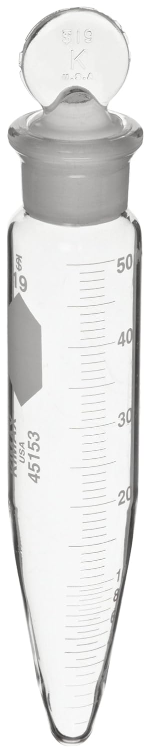 15mL centrifuge tube with a top finished to accept a ground glass joint stopper. Graduated and calibrated to contain. Scale, legend and marking spot are durable white ceramic enamel. (Do not centrifuge with stopper in tube) Replacement stopper is KIM-41900R. 15mL Capacity with 0.1mL Subdivisions. Stopper Size 13. Kimble #: 45153-15 Kimax
