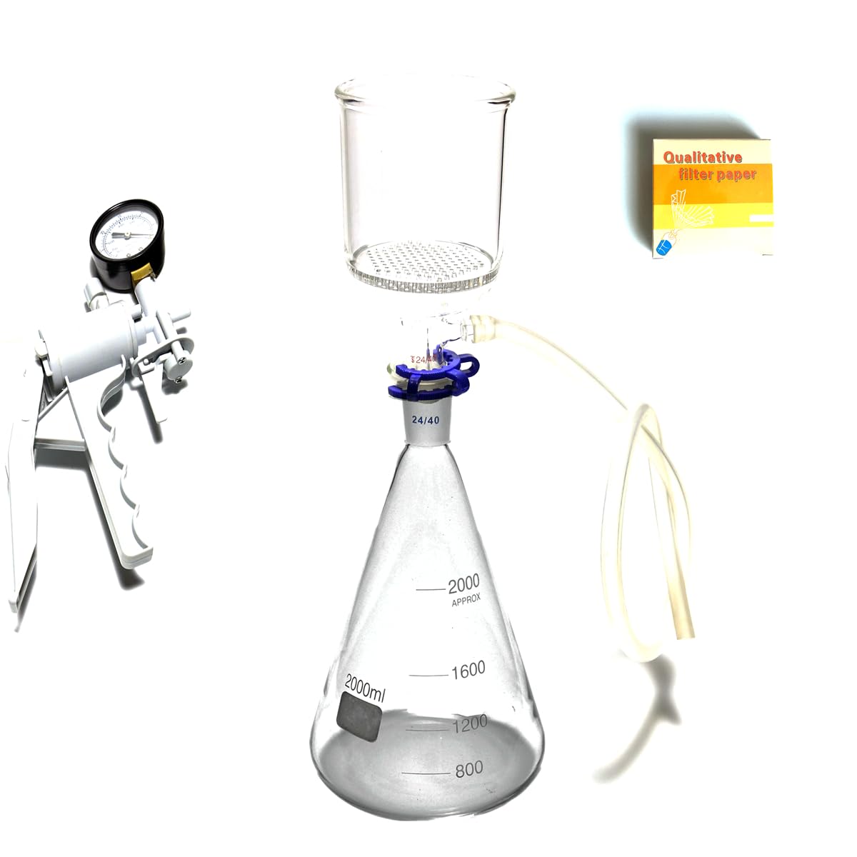 Glass Suction Filtration Kit Brand: Dinglab Funnel 70mm 350ml Flask 2000ml 24/40 Country of Manufacture: China 2000ml,Glass Suction Filtration Kit,70mm (Inner Diameter) Buchner Funnel & 2 Litre Erlenmeyer Flask 1.2000ml,24/40 Ground Joint, Glass Erlenmeyer Flask 1PC 2.350ml,24/40 Ground Joint,70mm,Glass Buchner Funnel Specifications 1, Buchner Funnel,350ml 2, Diameter 70mm Pore Plate,Pore diameter is 2mm. 3, With 10mm hose connection, 4, Material: borosilicate glass 3.3, 5, Joints size: 24/40 3.24# Plastic Clip 1PC 4.Handle Vacuum Pressure Pumps 1PC Lab Hand-held Vacuum Pump,Handle Vacuum Pressure Pumps,550mm Hg This vacuum pump could be used for vacuum suction filtration Max vacuum 550mm Hg 5.Vacuum Hose 1PC 6.Filter Paper 1PC Outer Diameter is 70mm. Speed is Medium.