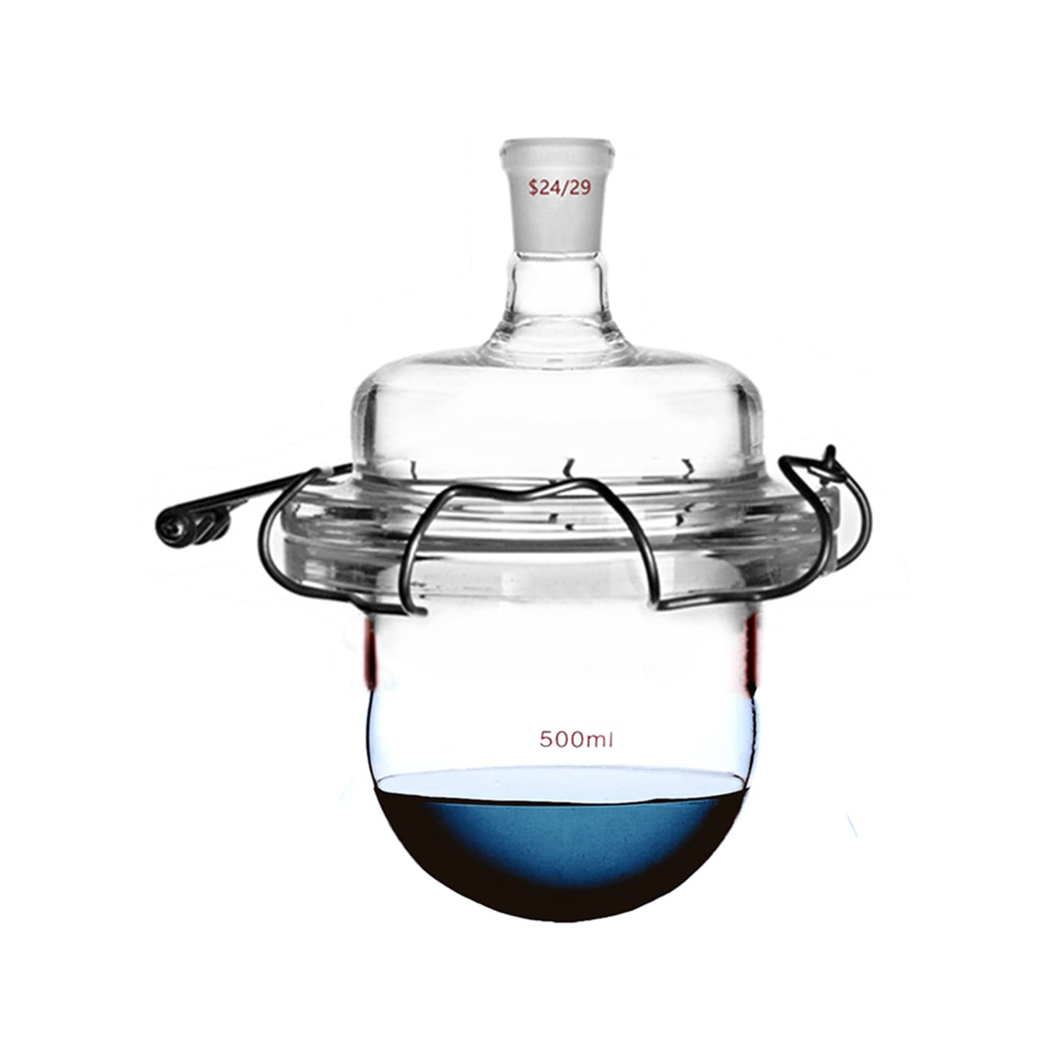 Deschem 24/29 Glass Reactor Single Neck Round Bottom Lab Reaction Flask Vessel W/1-Neck Lid and ClampMade From Borosilicate Glass 3.3.24/29 Glass Ground Joint Capacity 250ml 500ml 1000ml 2000ml 3000ml 5000ml 10000ml 20000ml 50000ml AvailableRound BottomStainless Steel ClampOuter DIameter of The Flange is 150mm