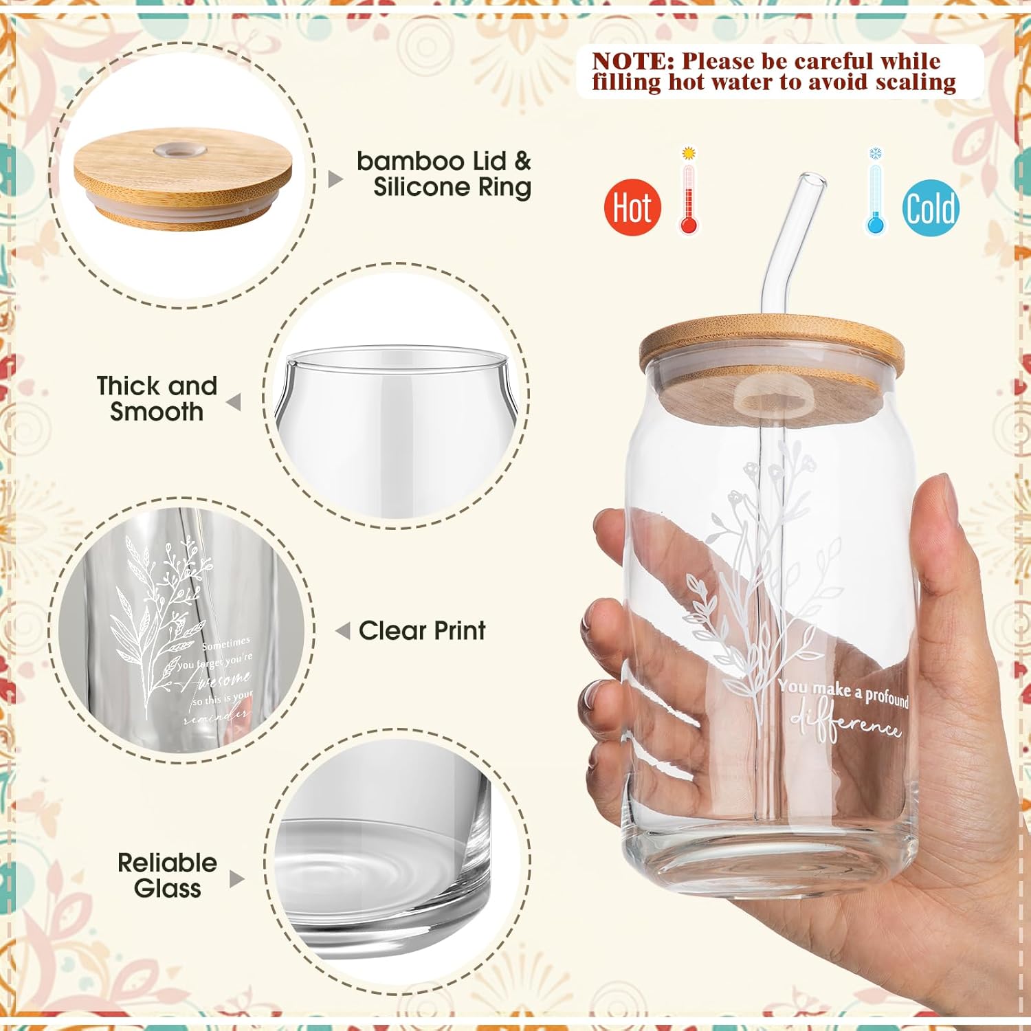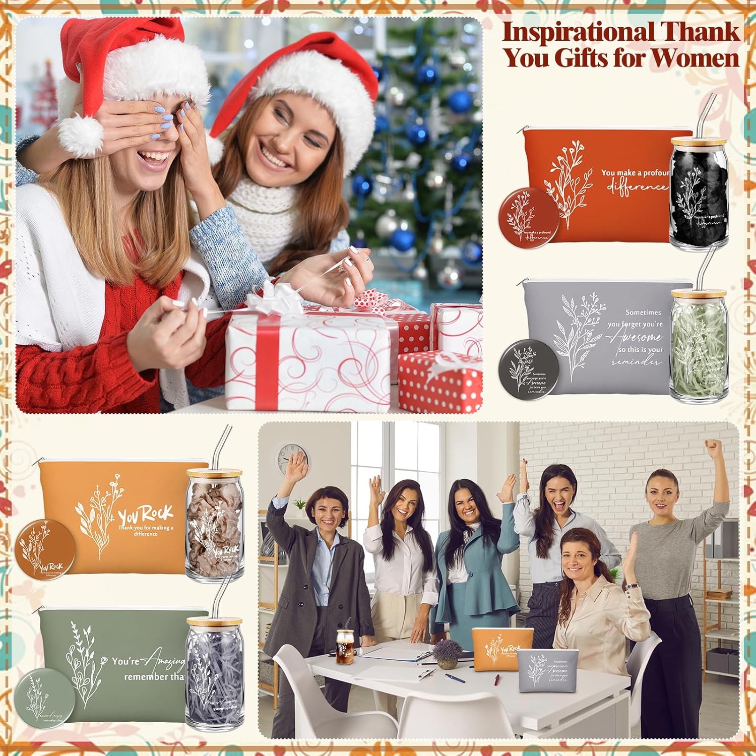 Features: Versatile and Functional Use: From holding your favorite beverages to organizing makeup essentials and providing an effortless makeup check, these products combine practicality with stylish design to meet everyday needs. Inspirational Quotes for Daily Motivation: Each item is adorned with uplifting and motivational quotes, making them ideal for encouraging positivity and appreciation in the workplace or at home. Specifications: Material: Tumbler: glass, wood Makeup bags: canvas Compact Mirror: plastic, mirror glass, metal Color: mainly Morandi color Size: Tumbler: 2.99 x 1.26 inches/ 7.6 x 3.2 cm, 17oz Makeup bags: 9.06 x 5.91 x 1.57 inches/ 23 x 15 x 4 cm Compact Mirror: 2.76 inches/ 7 cm in diameter Package includes: 4 x Tumblers 4 x Makeup bags 4 x Compact Mirrors Notes: Manual measurement, please allow slight errors on size. The color may exist a slight difference due to different screen displays