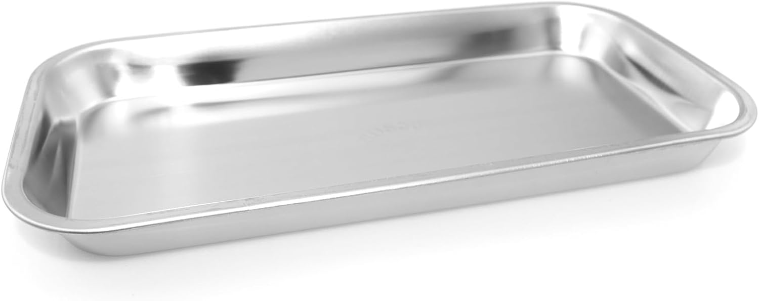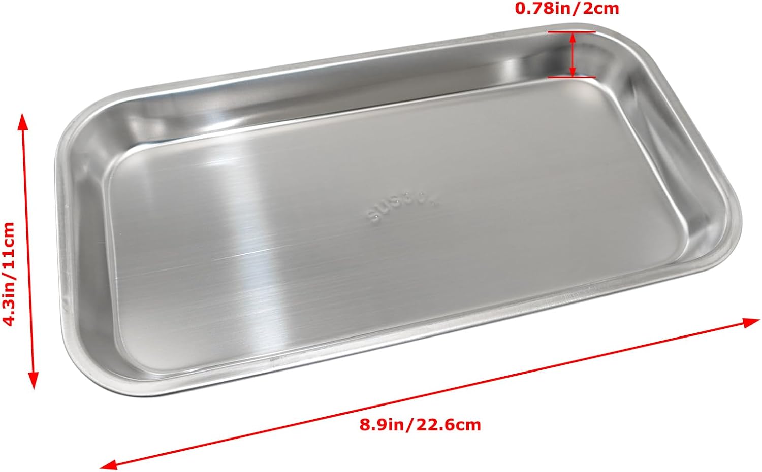 Name: 304 Stainless Steel Square Tray Material: 304 Stainless Steel Dimensions: 22.6 x 11 x 0.2 cm / 8.9 x 4.3 x 0.78 in Shape: Rectangular Please note: Dimensions are measured manually; slight variations may occur. Colours may appear slightly different due to variations in screen displays.