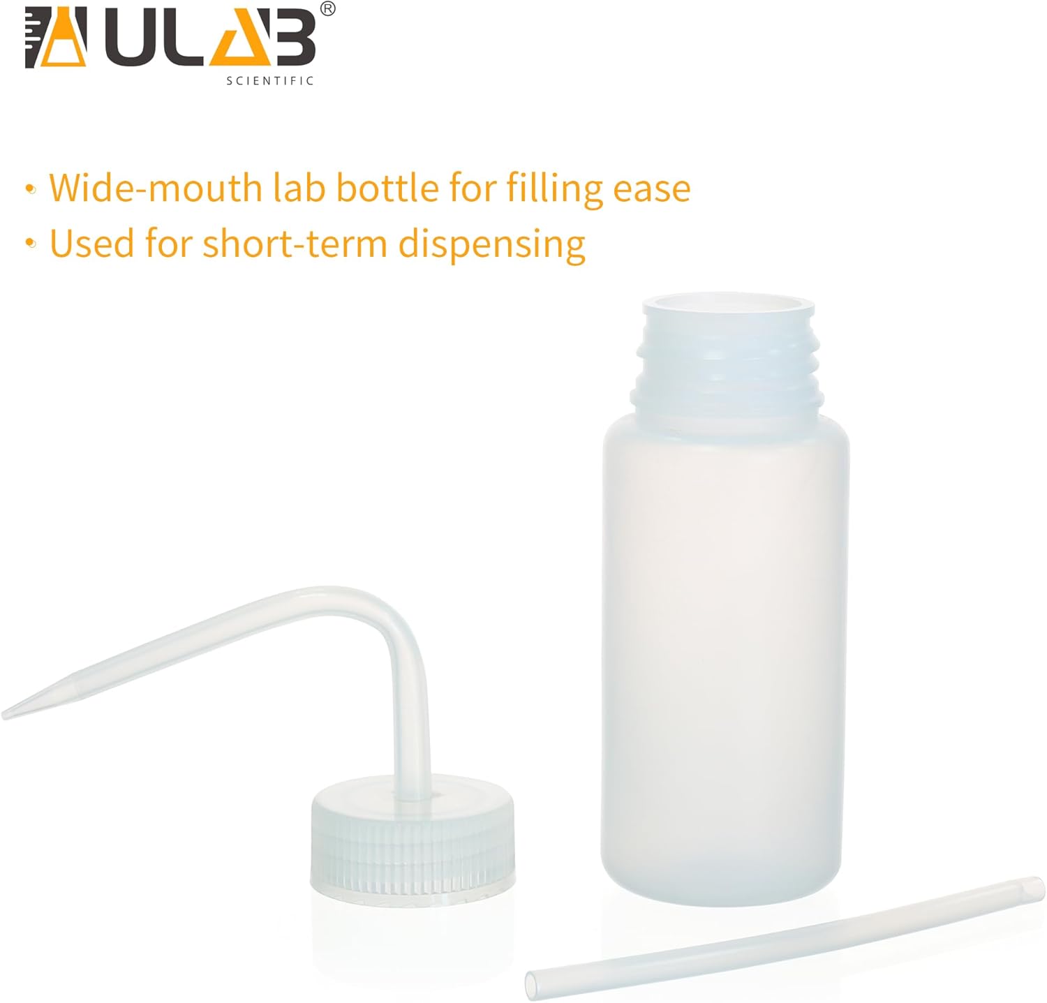 ULAB Safety Wash Bottles, 4pcs of Wide Mouth 500ml wash bottles. Safety Wash Bottle with Wide Mouth, used for Short-term Dispensing. Bottles made of LDPE material, with polypropylene screw/stem and draw tube. Designed to dispense uniformly through the top with a closure and stem molded in one piece for leak-proof service. Tip can be cut back to provide increased flow. Tight fit of draw tube and closure prevents separation when squeezing bottle. ULAB wash bottles are suitable for use in chemistry and biology applications, as well as in pharmaceutical and scientific testing. After-Sales Service: ULAB Scientific guarantees that no sale is complete unless the customer is satisfied. If you have any questions or suggestions on our products or service, please do feel free to contact us. You'll get our reply within 24 hours. Thanks for your patience.