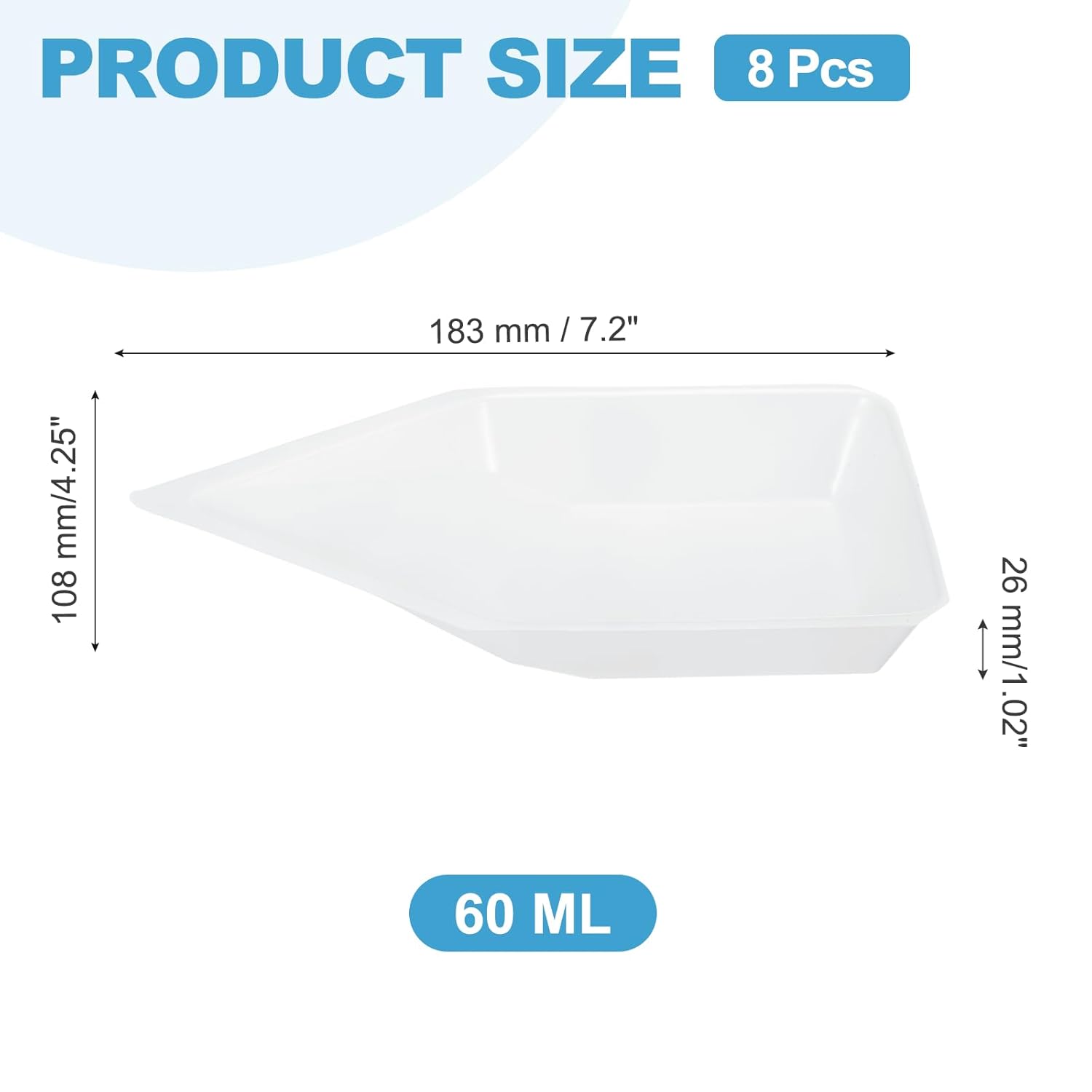 These weighing boats are perfect for weighing samples, powders, and liquids in scientific labs, plus mixing tasks. They work great for compound formulation, food prep, essential oil blending, jewelry making, and crafts. They also excel at weighing loose tea leaves, sorting small components, serving as enamel screening trays, and organizing lab kit supplies. Whether you are a seasoned lab professional, home baker, or hobbyist, these boats offer reliable performance for accurate measurements and easy material handling.Specification:Color: WhiteMaterial: PlasticHeight: 26 mm/1.02 InchTop Across Width: 108 mm/4.25 InchTop Side Length: 183 mm / 7.2 InchCapacity Size: 60 MLPackage Contents: 8Pcs x Weigh BoatsAdvantage:This anti-static plastic tray prevents powder scattering and sample loss, ensuring precise measurements. Flexible corners allow multi-angle pouring of liquids and powders, preventing spills and enabling controlled transfer. Flat bottom ensures stable weighing, while the stackable shape saves space. These weighing boats have a smooth, non-stick surface that resists powder adhesion and enables easy cleaning. The disposable design eliminates cleaning time and ensures purity.Instruction:Easy to use and clean. Simply place the weighing boat on your scale and tare the weight before adding your sample.NOTE: Please kindly note that there is a tolerance in measurement and do not use this product to weigh heavy objects.