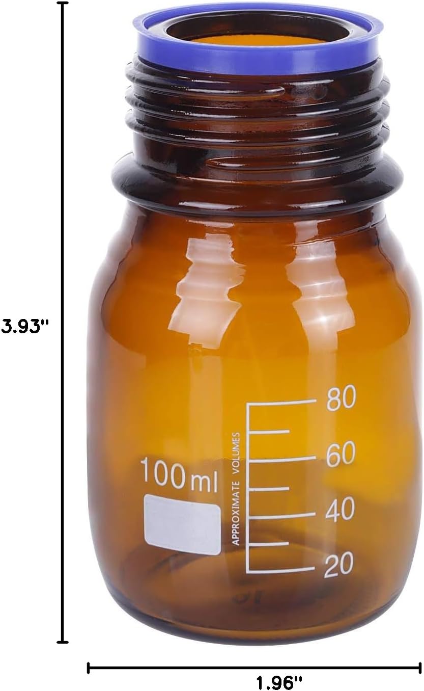 · Capacity: 100 mL/3.4 oz, permanent white enamel graduations from 20 mL to 80 mL, accurate scales,easy labeling; Dimension: OD: 1.96", Neck ID: 1.18", Height: 3.93" · Amber Glass: thick, tough, high quality, reduce UV light, low coefficients of thermal expansion, resistant to thermal shock, high chemical resistance in corrosive enviroments · GL45 Polypropylene Screw Cap: Blue GL45 screw cap, tight seal, drip-free pouring ring, airtight seal, no leaking · Autoclavable: Max 120℃ for bottles, 140℃ for caps, durable, reusable, enviromental friendly · Glass bottles fit for storing chemicals, liquids, powders, biologicals and other liquid solutions for lab, experiment, chemistry, scientific studies and houshold home use
