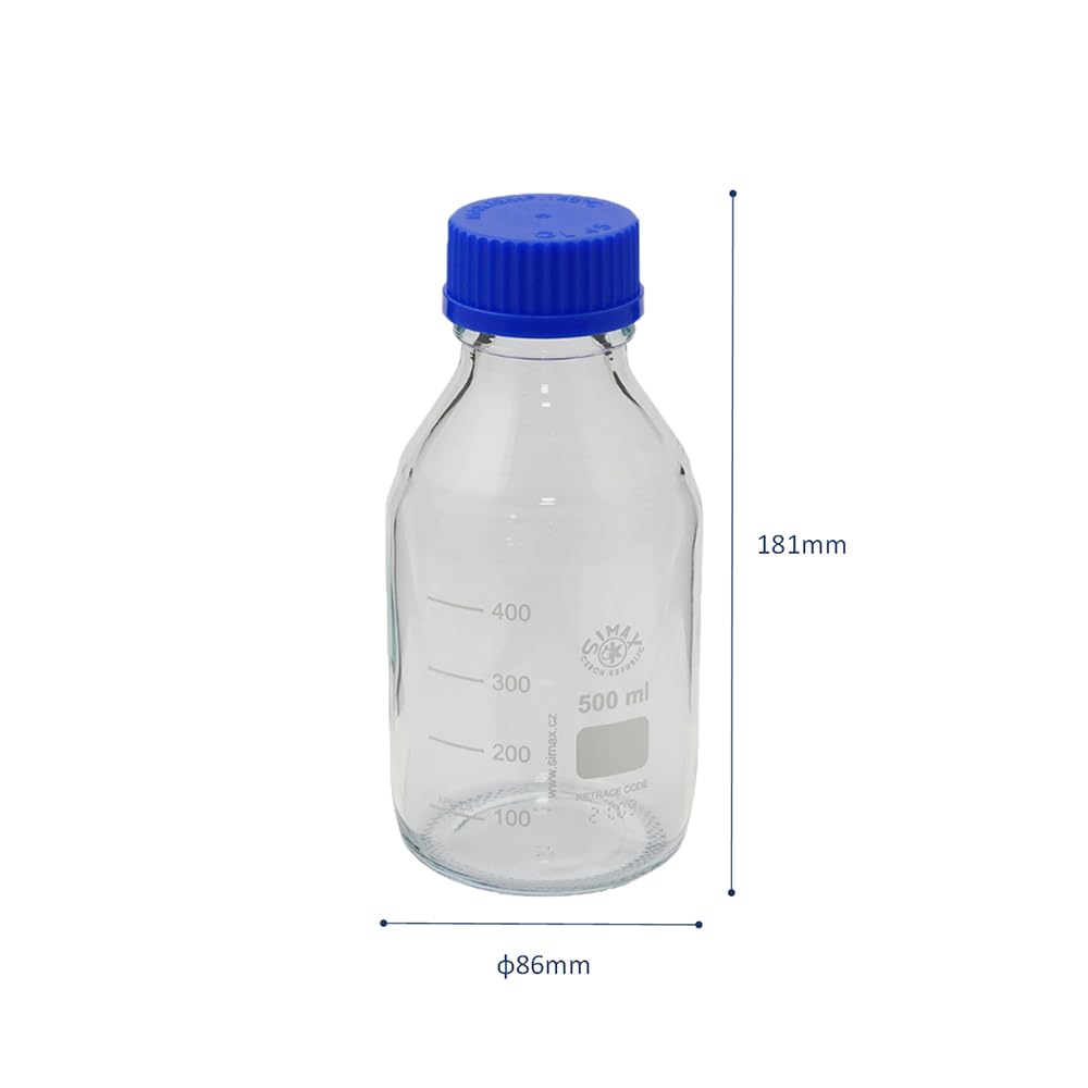 ●capacity (mL): 500 ● outer diameter x Height (mm): φ 86 x 181 ● material: Body/Borosilicate Glass, Cap/Seal Ring/PP (Polypropylene) ● Screw Cap standards: GL -45 ● autoclave possible ● * When applying the autoclave Sterilization, remove the cap or loosen it by 1 turn or more.