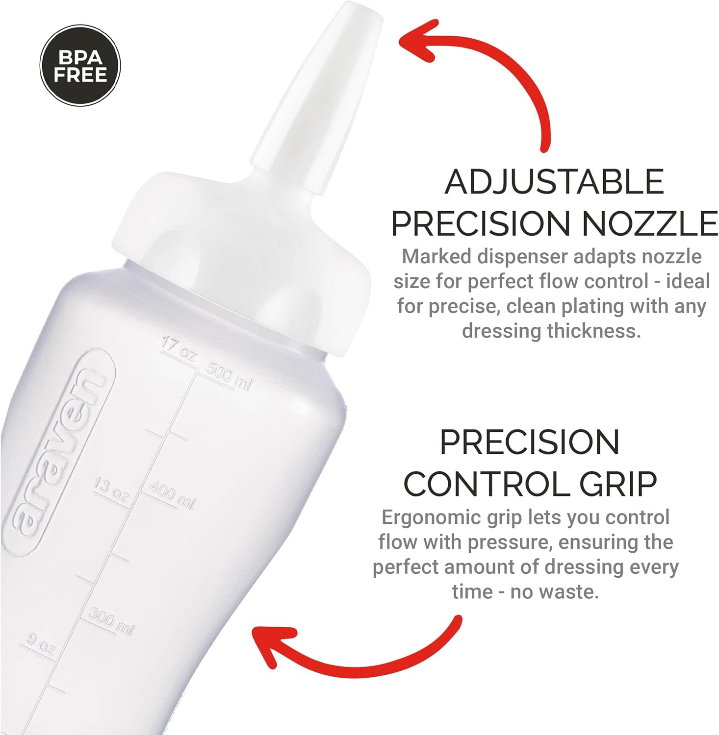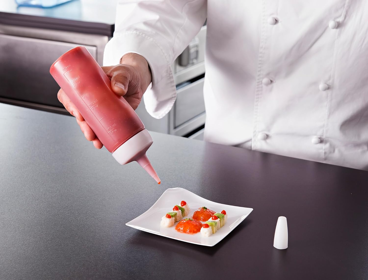 Elevate your kitchen efficiency and presentation with the Avraven 01377 Sauce Bottle designed for precise, clean, and mess-free plating. Crafted with professionals in mind, this dispenser features an ergonomic grip area that lets you control the flow of sauce or dressing with gentle pressure—ensuring consistent application with zero waste. A silicone non-drip valve at the tip intercepts clogging and messy buildup, while the closure valve doubles as a cap, allowing you to store sauces directly in the dispenser. Any excess liquid is neatly redirected back into the bottle via a smart inlet system at the cap base. Whether you're working with light oils or thick dressings, the adjustable nozzle accommodates different flow rates. With a wide-mouth opening for easy filling and cleaning, plus a dual-position measuring scale and traceability panel for accurate tracking, this dispenser combines functionality with professional-grade precision. Ideal for foodservice settings, catering, or plating with style in any kitchen.