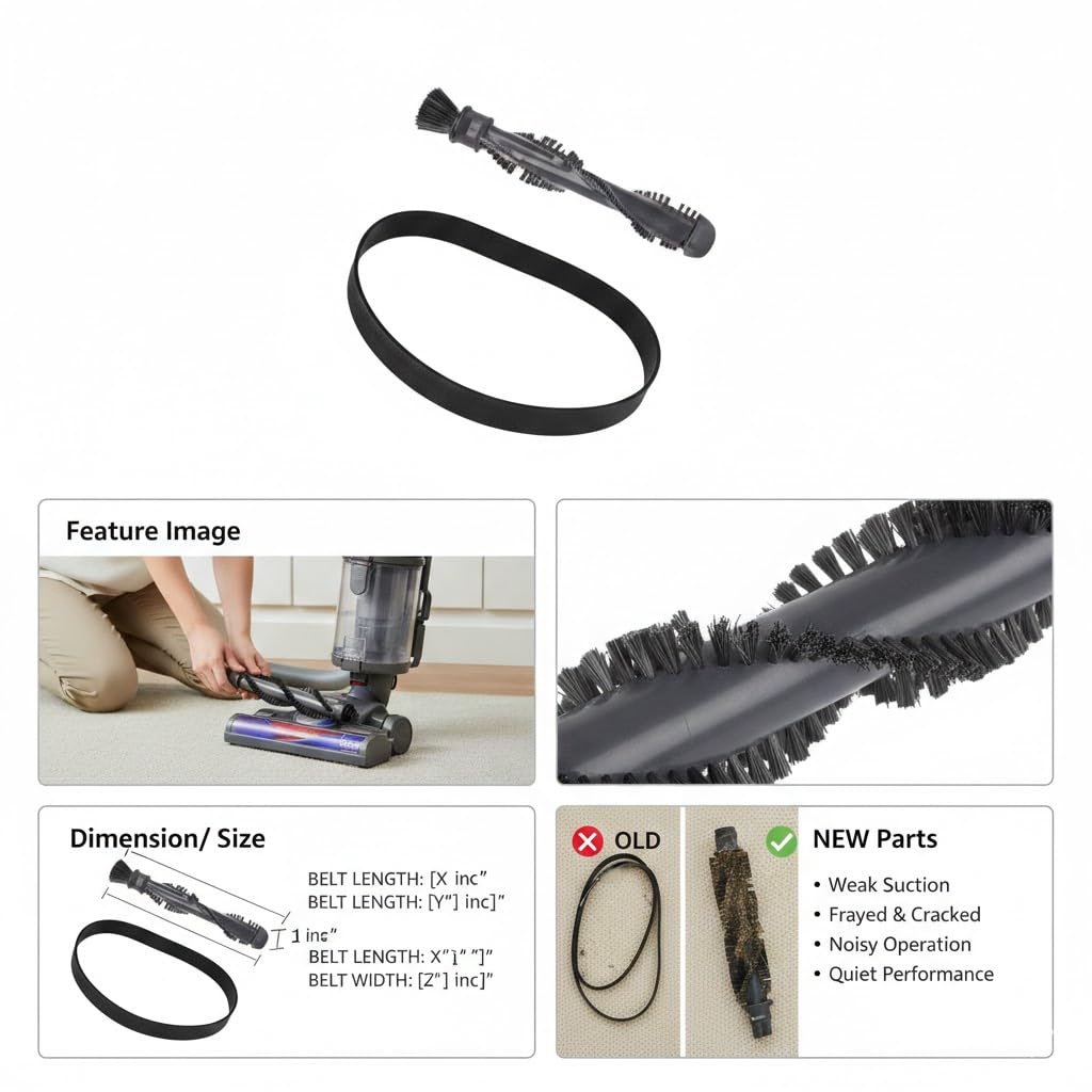 Replacement Roller Brush with 2-Pack Flat Belts for Bissell Vacuums is designed to restore strong agitation and smooth belt drive performance to compatible Bissell upright and carpet cleaner models. This kit includes one durable roller brush and two flat drive belts (Part Nos. 203-8072 & 18-3102-06), commonly used in Style 7, 9, 10, 12, and 14 belt systems. The roller brush features stiff, high-density bristles that loosen and lift embedded dirt, pet hair, and debris from carpets and rugs, while the flat belts ensure consistent power transfer from the motor to the brush roll. Ideal for replacing worn or stretched components, this set helps improve cleaning efficiency and extend the life of your vacuum cleaner.