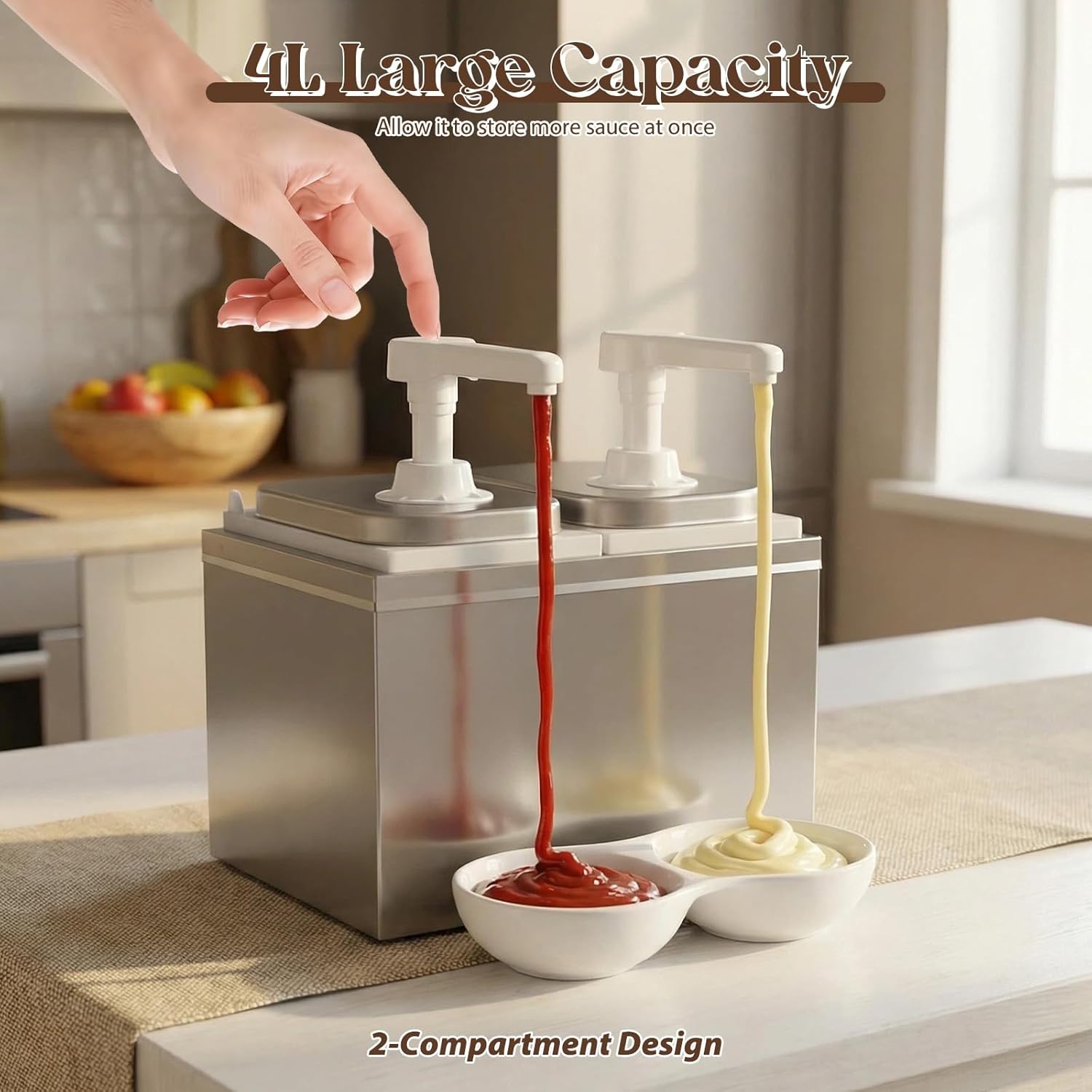 Features: Item type: ketchup dispenser. Material: stainless steel and polypropylene. Capacity: 4 litres. Dimensions: 24.5 x 20 x 28 cm / 9.6 x 7.9 x 11 inches. Packing list: 1 x sauce dispenser. 4 x pumps.