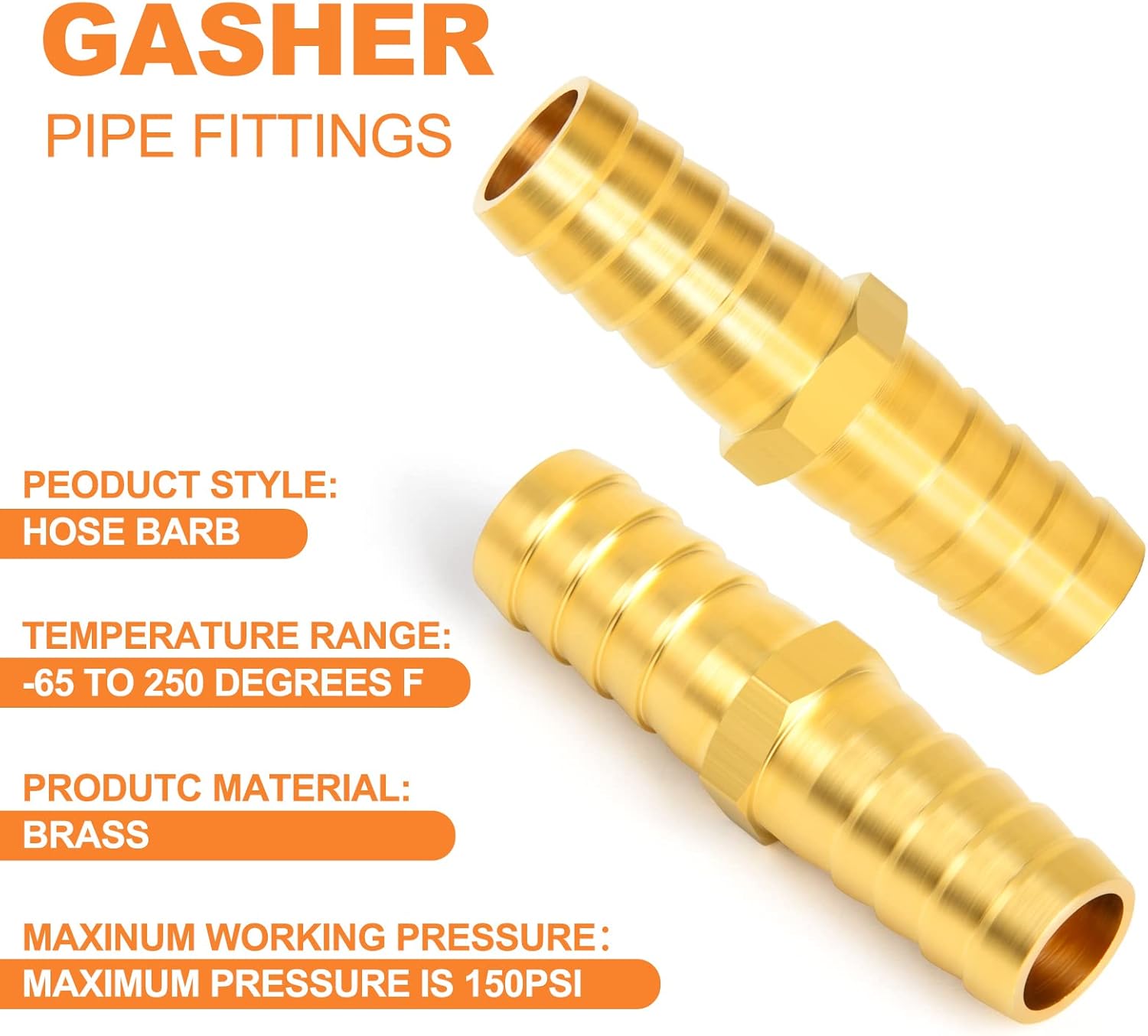 This Gasher Series barb reducer fitting is made of forged brass and connects two hoses.This fitting has barbed ends to create a tight seal on a hose when used with a hose clamp.It is made of forged brass for greater strength than cast brassBasic Parameter* Material: Brass* Size: 1/2" X 1/2" Brass Barb Splicer Reducer Fitting* Maximum working pressure:150 psi-Type : Barb Hose Mender/Splicer Reducer. Adapter for connecting a hose to a hose threaded connection of a different diameter-Brass for corrosion resistance, ductility at high temperatures, and low magnetic permeability-Temperatures range from -65 to 250 F. 150 PSI maximum working pressure-Contains no lead. NOT FOR POTABLE WATERPackage Content20 x 1/2" Brass Barb Hose Fitting40 x Hose Clamps