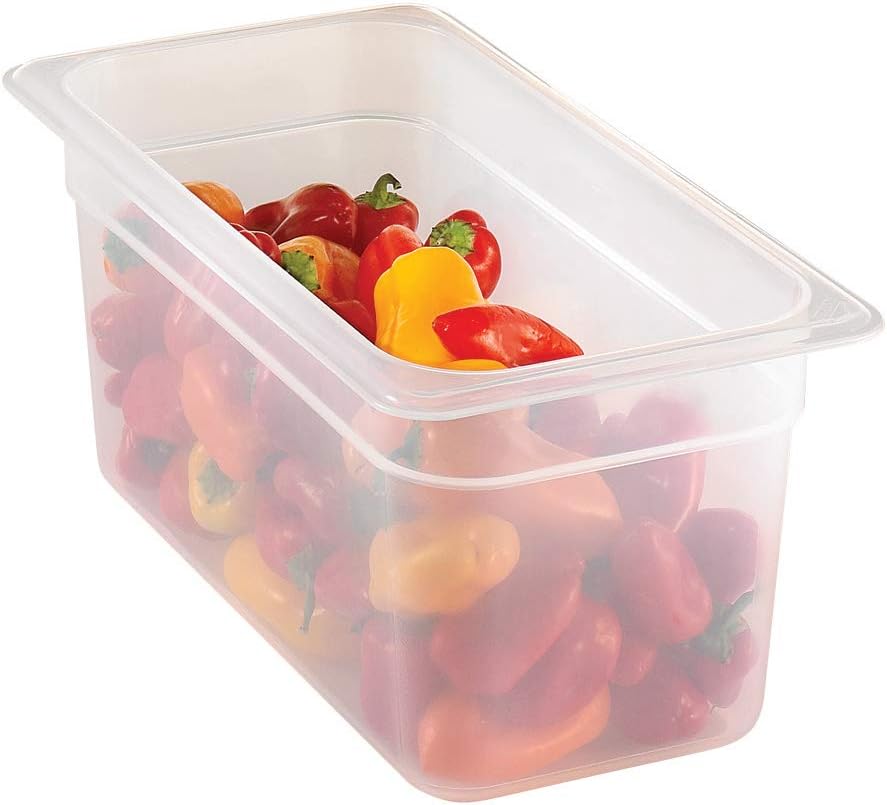 Translucent food pan: an economic food pan choice for prep tables and vending carts; translucent polypropylene material allows for content visibility for inventory management and provides a high chemical resistance; non-stick smooth interior surface increases yield and eases cleaning; withstands temperatures ranges from -40° Fahrenheit to 160° Fahrenheit (-40° Celsius to 70° Celsius); precisely designed to Gastronorm GN specifications, with a large radius base to reduce food waste Uniform 1/2 inch (1.27 cm) flange width ensures correct fit in prep tables and food bars; ideal for transporting in top-loading Cambro food-pan carriers; Cambro food pans are made from commercial food-grade durable materials that maintain their shape without cracking, bending, denting-even under heavy use; corners and edges stay smooth, reducing the risk of injury that can occur with metal pans; precise molding and design ensure safe stacking during storage; pans do not stick or wedge together. Unlike metal pans that bend over time, Cambro food pans sit level on refrigerated drawers, prep and steam tables with corners that stay flat, keeping cold, heat or steam from escaping through gaps; this prevents costly energy resources from going to waste; food pans keep products as cold as metal for as long with less condensation; food-pan contents are easy to identify from a distance and from any angle when stored in walk-in or reach-in, for less unneeded handling and better inventory control. Avoid pests in the kitchen--do not bring dirty and potentially contaminated shipping cartons into prep and storage areas; if receiving organic or locally grown produce grown without traditional pesticides, inspect product for pests in receiving area; store product in coolers and freezers within 15 min. to stop the growth of foodborne-illness-causing bacteria; store all products at least 6 in. (15.3 cm) off floor to prevent cross-contamination.