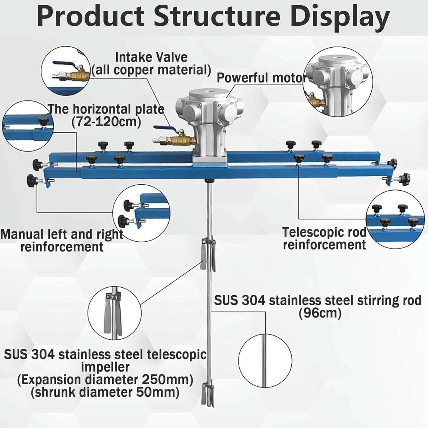 This pneumatic agitator is designed for greater efficiency and durability, with a 5-cylinder pneumatic engine head for smooth, even operation. It offers continuous speed regulation, with an all-copper air intake valve that allows speed control from 0 to 1300 RPM by adjusting the compressed air flow. Installation is easy thanks to a retractable horizontal plate and a fixed knob for easy attachment. In other words, it's the same.Product Parameters:Product name: pneumatic agitator. In other words, it's the same.Speed: 0-1300 rpm. In other words, it's the same.Length of horizontal plate: 72-120 cm.Stir rod length: 96 cm.Stirring rod diameter: 1.5 cm.Impeller diameter: 25 cm.Agitation capacity: 0-1000 kg.Size: 105 x 21 x 21 cm.Material of stirring rod and impeller: SUS304 stainless steel. In other words, it's the same.Recommendation: Ideal for removing slightly viscous solutions, such as paints and water-based pigments. In other words, it's the same.Package contents:1 pneumatic agitator. In other words, it's the same.1 instruction manual (Spanish language not guaranteed)