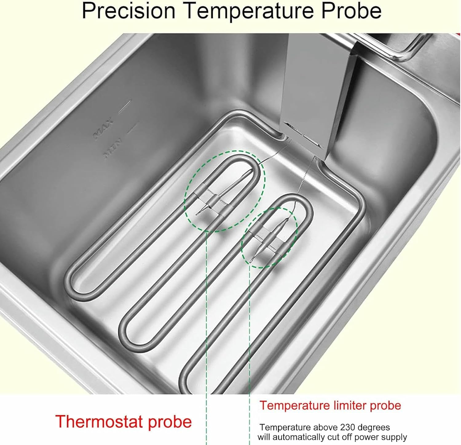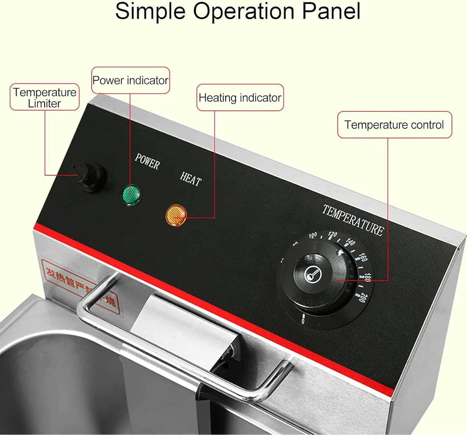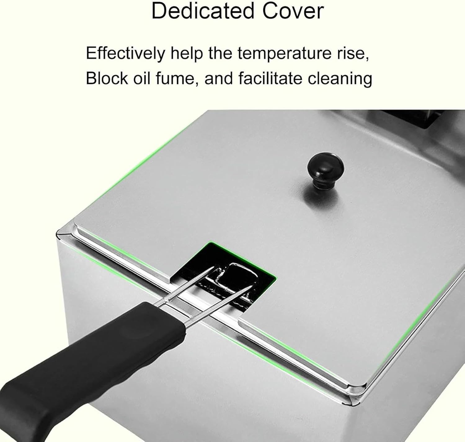 Features of deep fryerThe rotating temperature controller allows you to easily set the temperature between 60°C (140°F) and 200°C (392°F), and you can adjust the temperature at any time according to your cooking needs.Equipped with precision temperature control needle to accurately control the oil temperature;U-shaped heating tube increases the contact area with the oil and quickly heats up;With cover design, it can effectively prevent the oil from splashing out, and it is safer;With non-slip foot pads, it is more stable and effectively prevents slipping;The thick stainless steel inner pot is Reliable and easy to disassemble and assemble;The frying basket with plastic handle prevents hot hands, safe and convenient operation;Suitable for all kinds of cooking, French fries, chicken, fish, onion rings, etc.Specification:Name: electric fryerCapacity: 8L, 8L+8LPower supply: 220V/50HzTemperature control range: 60-200℃/140-392℉power:8L: 2.8KW8L+8L:2.8KW+2.8KWsize:8L: 42.5*26.5*28cm8L+8L:42.5*53*28cmCaution: Keep away from children. When the device is connected to a power outlet, do not leave the device unattended.TIPS: It is strictly forbidden to use the fryer to heat solid oil. Solid oil includes animal oil, solid butter, etc. The use of solid oil can easily make food taste worse. When frying explosive food, be sure to cover it to prevent oil splashing!