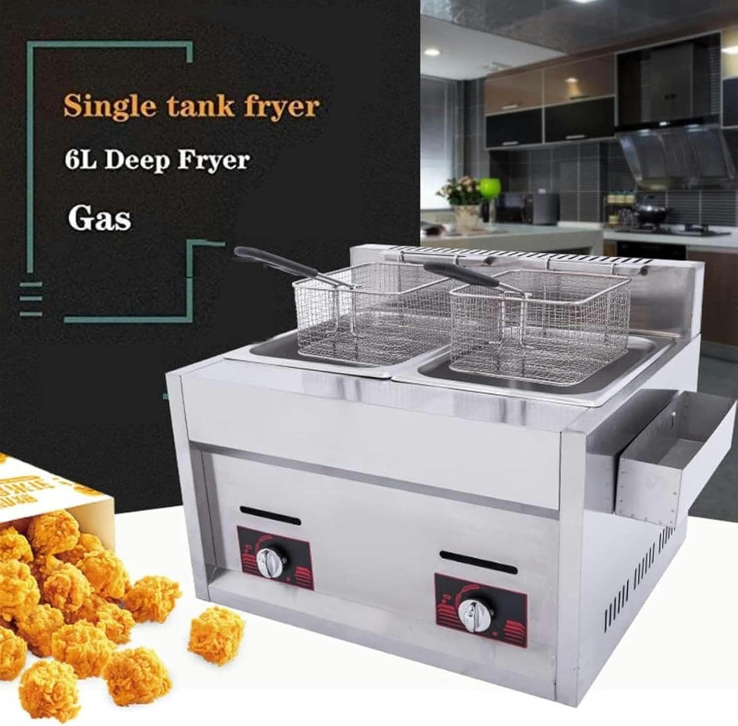 Our stainless steel fryers with removable oil container and non-stick pan make the fryer fast and easy to clean, easy to hold, and have cool touch handles that make the fryer safer. Great for home and commercial use, great for french fries, fish, chicken nuggets, and more.>>> Specification:Product name: deep fryerMaterial: Stainless steelHeating method: liquefied petroleum gas (gas)Capacity: 6L, 12LPot body size: 30x47.5x35cm/56.5x47.5x43cmInner pot size: 30×24×15cm>>> Features:- Counterbore stabilizing flame design, no flames, flame burning more evenly.- Stainless steel, automotive-grade rust-proof and durable, a fusion of beauty and texture.- Large air duct design allows air and fuel to mix, burn more fully, and heat up faster.- The fire power can be freely adjusted by the switch to help you prepare food better and improve efficiency.>>> Notice:1. Keep away from children. Do not leave this product unattended when it is connected to an electrical outlet.2. To avoid sudden power outages, it is recommended to plug the fryer into a wall socket instead of a terminal block socket, and it is not allowed to plug both plugs into the same socket strip.3. It is strictly forbidden to use the frying pan to heat solid oil. Using solid oil can easily spoil the food. When frying explosive food, be sure to cover it to prevent oil from splashing!We are committed to providing quality service. If you have any questions, please contact us and we will respond to emails within 24 hours.